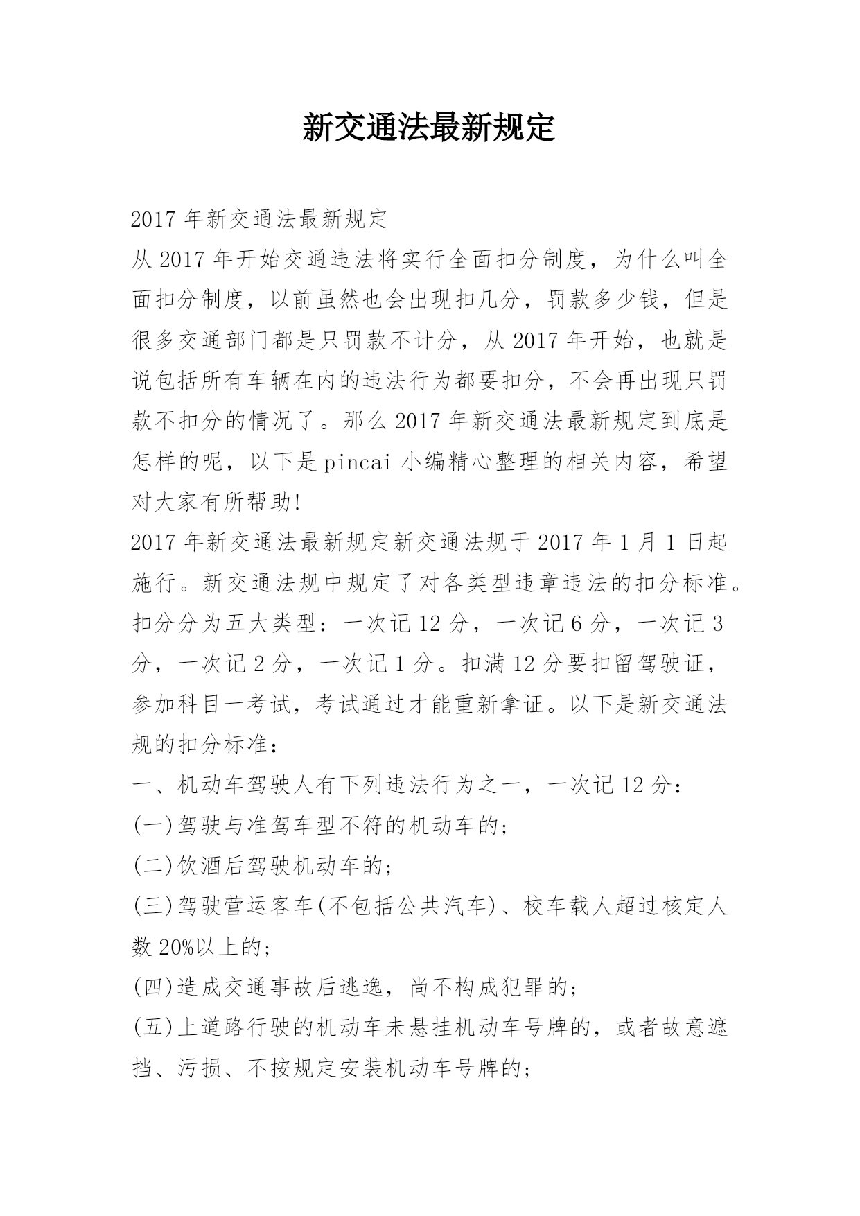 新交通法最新规定2017年新交通法最新规定从2017年开始交通违法将实行全面扣分制度,为什么叫全面扣分制度,以前虽然也会出现扣几分,罚款多少钱,但是很多交通部门都是只罚款不计分,从2017年开始,也就是说包括所有车辆在内的违法行为都要扣分,不会再出现只罚款不扣分的情况了。那么2017年新交通法最新规定到底是怎样的呢,以下是pincai小编精心整理的相关内容,希望对大家有所帮助!2017年新交通法最新规定新交通法规于2017年1月1日起施行。新交通法规中规定了对各类型违章违法的扣分标准。扣分分为五大类型:一