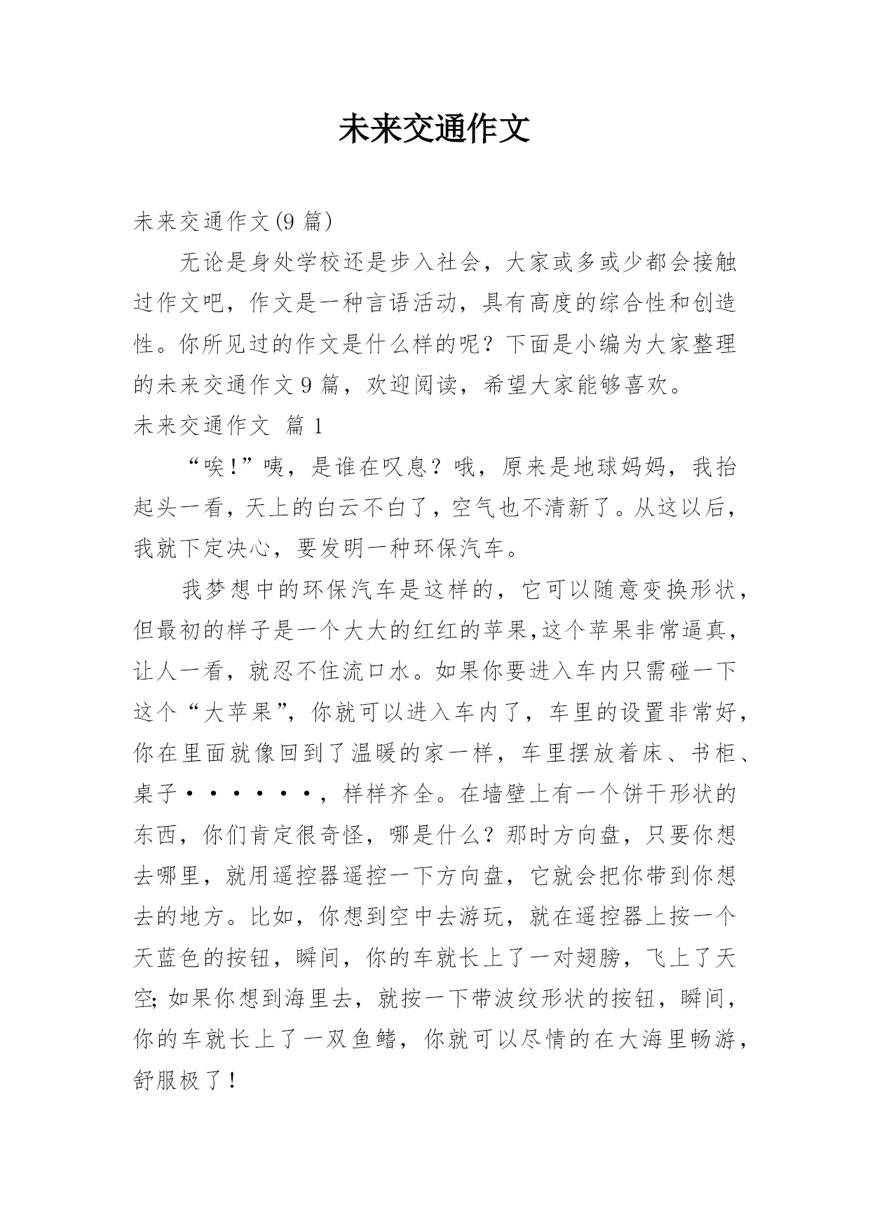 未来交通作文未来交通作文(9篇)无论是身处学校还是步入社会,大家或多或少都会接触过作文吧,作文是一种言语活动,具有高度的综合性和创造性。你所见过的作文是什么样的呢?下面是小编为大家整理的未来交通作文9篇,欢迎阅读,希望大家能够喜欢。未来交通作文篇1“唉!”咦,是谁在叹息?哦,原来是地球妈妈,我抬起头一看,天上的白云不白了,空气也不清新了。从这以后,我就下定决心,要发明一种环保汽车。我梦想中的环保汽车是这样的,它可以随意变换形状,但最初的样子是一个大大的红红的苹果,这个苹果非常逼真,让人一看,就忍不住流口水