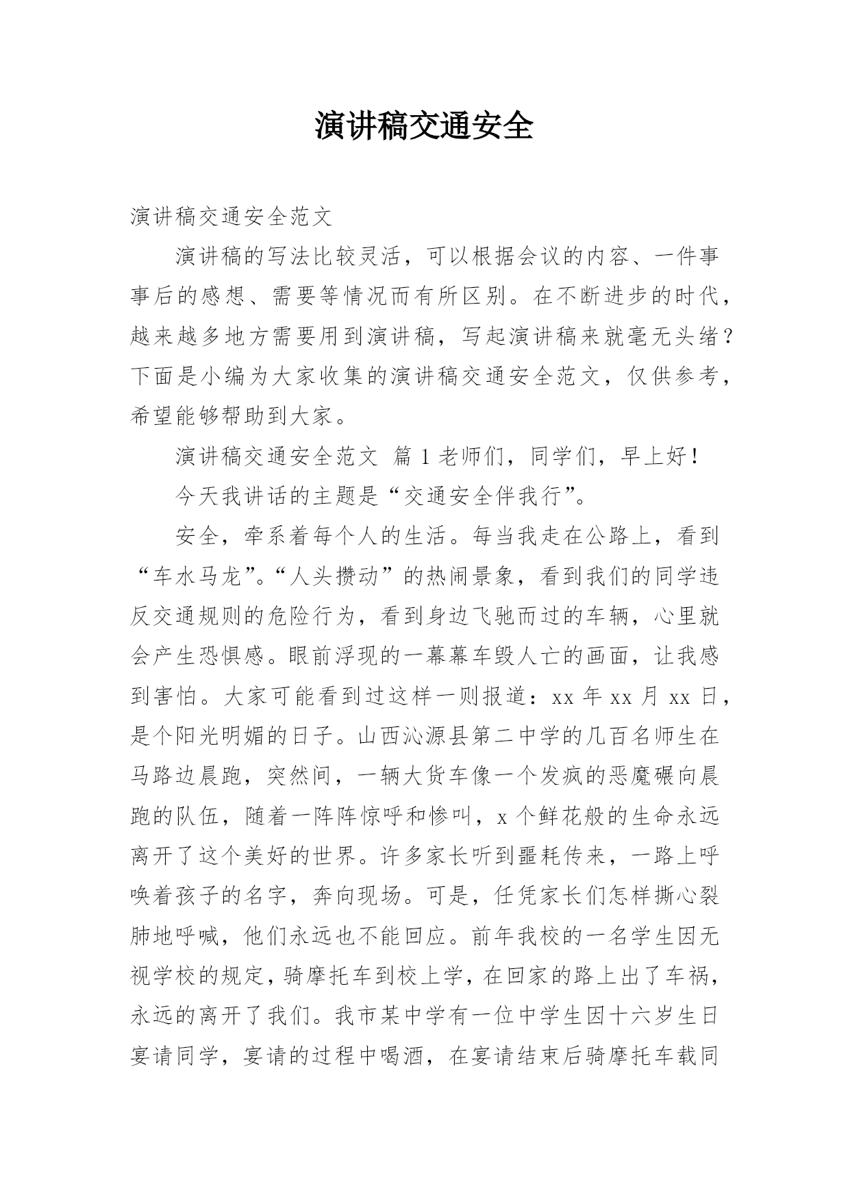 演讲稿交通安全演讲稿交通安全范文演讲稿的写法比较灵活,可以根据会议的内容、一件事事后的感想、需要等情况而有所区别。在不断进步的时代,越来越多地方需要用到演讲稿,写起演讲稿来就毫无头绪?下面是小编为大家收集的演讲稿交通安全范文,仅供参考,希望能够帮助到大家。演讲稿交通安全范文篇1老师们,同学们,早上好!今天我讲话的主题是“交通安全伴我行”。安全,牵系着每个人的生活。每当我走在公路上,看到“车水马龙”。“人头攒动”的热闹景象,看到我们的同学违反交通规则的危险行为,看到身边飞驰而过的车辆,心里就会产生恐惧感。眼