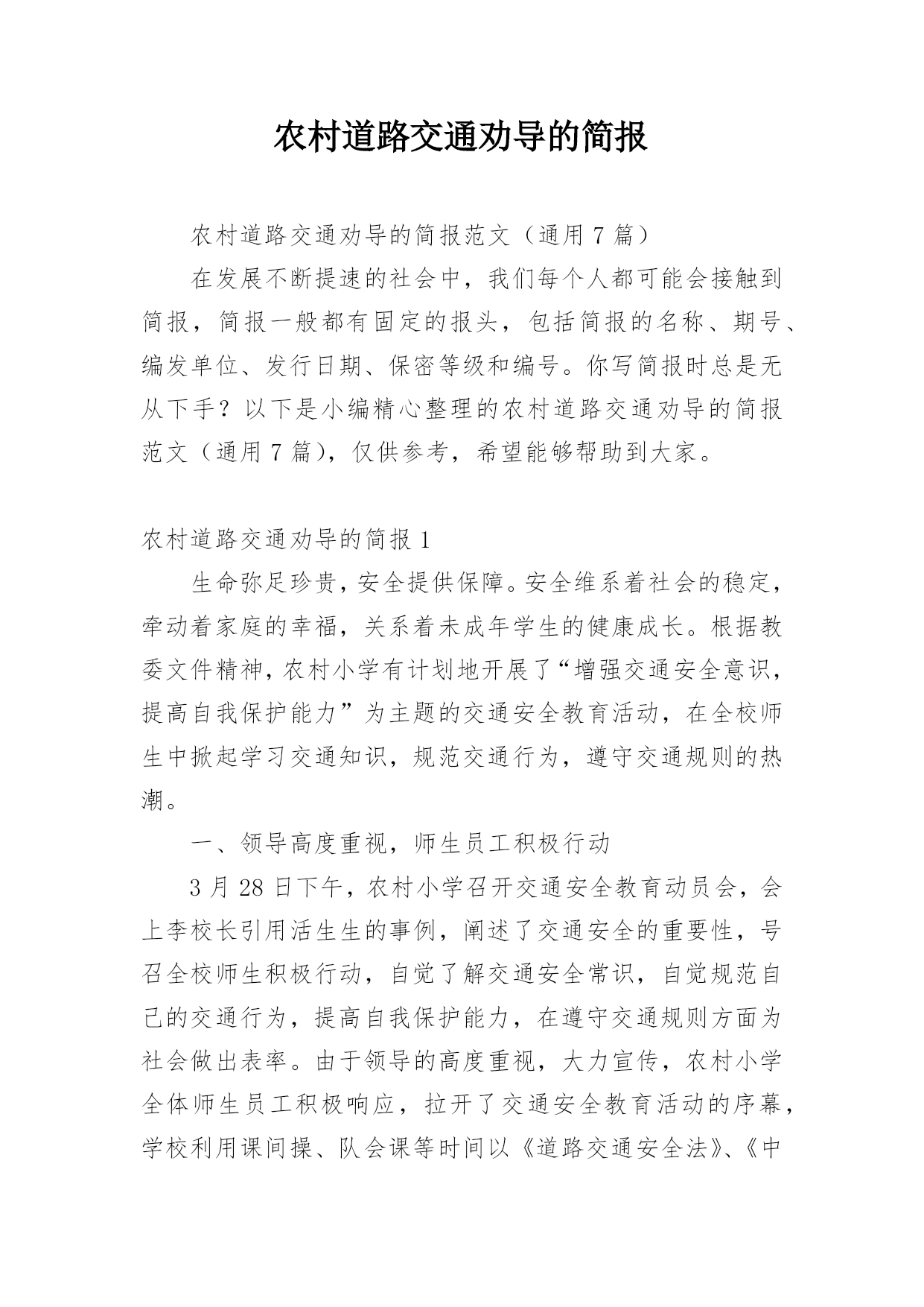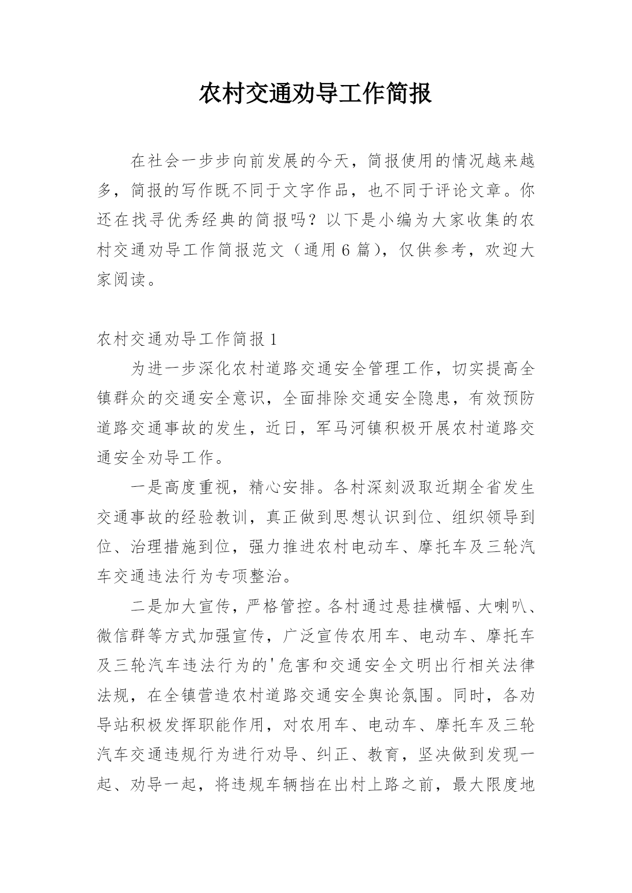 农村交通劝导工作简报在社会一步步向前发展的今天,简报使用的情况越来越多,简报的写作既不同于文字作品,也不同于评论文章。你还在找寻优秀经典的简报吗?以下是小编为大家收集的农村交通劝导工作简报范文(通用6篇),仅供参考,欢迎大家阅读。农村交通劝导工作简报1为进一步深化农村道路交通安全管理工作,切实提高全镇群众的交通安全意识,全面排除交通安全隐患,有效预防道路交通事故的发生,近日,军马河镇积极开展农村道路交通安全劝导工作。一是高度重视,精心安排。各村深刻汲取近期全省发生交通事故的经验教训,真正做到思想认识到位、
