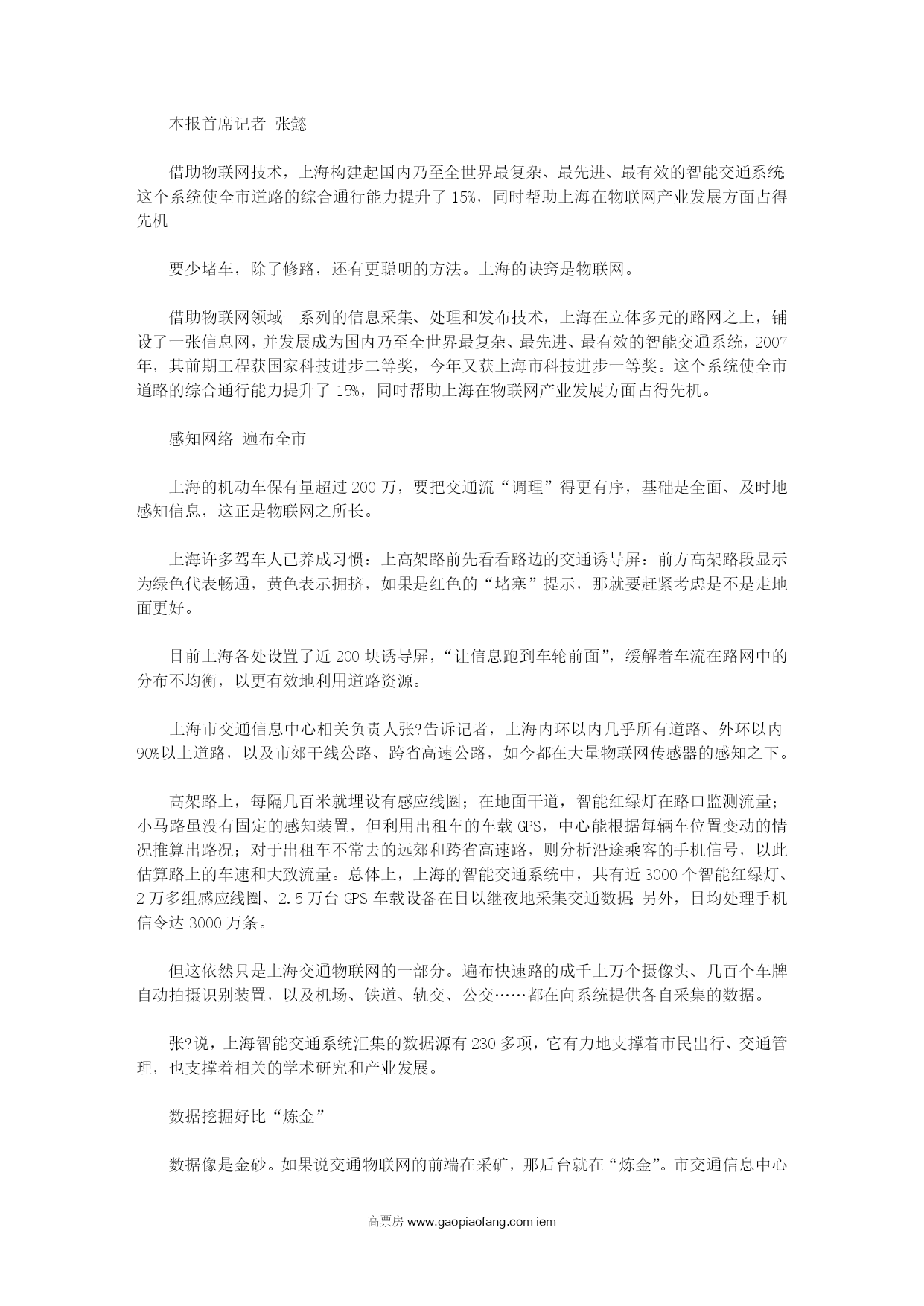 高票房www.gaopiaofang.comiem本报首席记者张懿借助物联网技术,上海构建起国内乃至全世界最复杂、最先进、最有效的智能交通系统;这个系统使全市道路的综合通行能力提升了15%,同时帮助上海在物联网产业发展方面占得先机要少堵车,除了修路,还有更聪明的方法。上海的诀窍是物联网。借助物联网领域一系列的信息采集、处理和发布技术,上海在立体多元的路网之上,铺设了一张信息网,并发展成为国内乃至全世界最复杂、最先进、最有效的智能交通系统,2007年,其前期工程获国家科技进步二等奖,今年又获上海市科技进步一