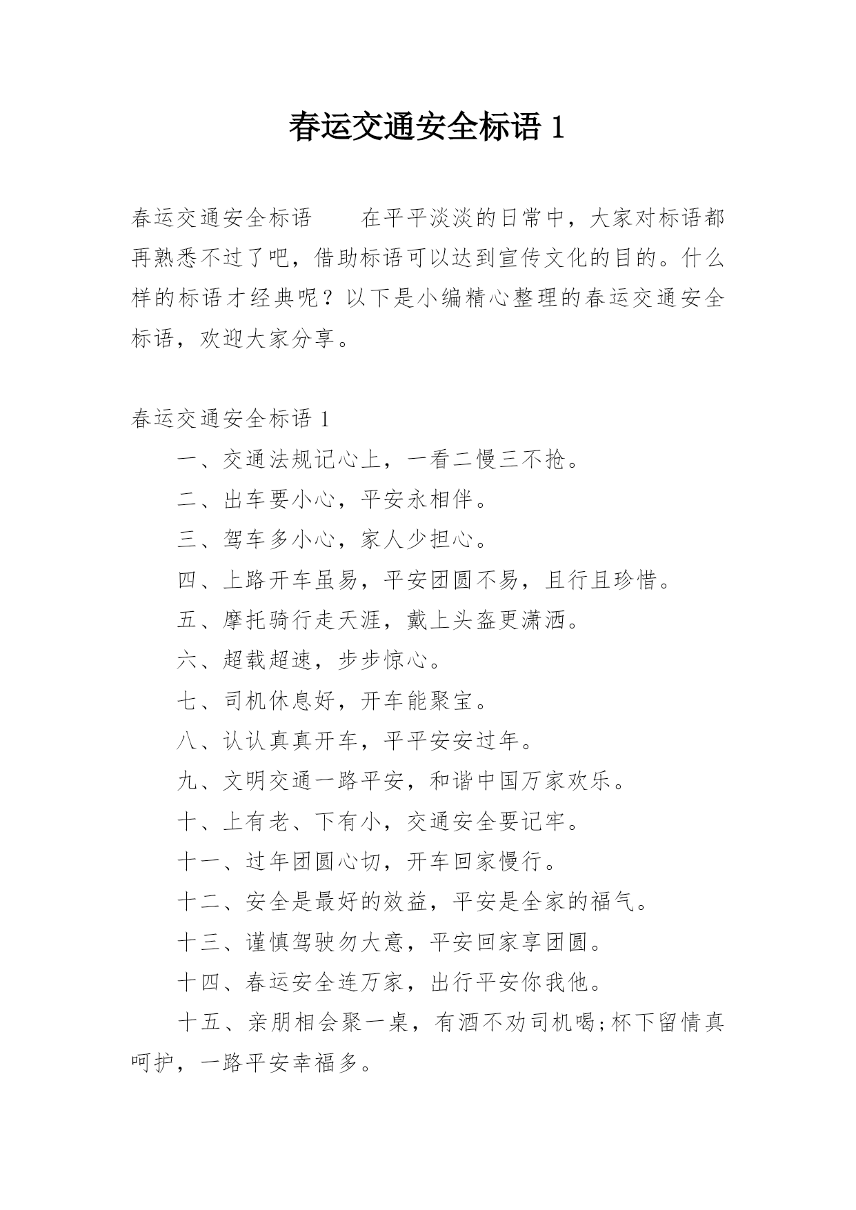 春运交通安全标语1春运交通安全标语在平平淡淡的日常中,大家对标语都再熟悉不过了吧,借助标语可以达到宣传文化的目的。什么样的标语才经典呢?以下是小编精心整理的春运交通安全标语,欢迎大家分享。春运交通安全标语1一、交通法规记心上,一看二慢三不抢。二、出车要小心,平安永相伴。三、驾车多小心,家人少担心。四、上路开车虽易,平安团圆不易,且行且珍惜。五、摩托骑行走天涯,戴上头盔更潇洒。六、超载超速,步步惊心。七、司机休息好,开车能聚宝。八、认认真真开车,平平安安过年。九、文明交通一路平安,和谐中国万家欢乐。十、上有