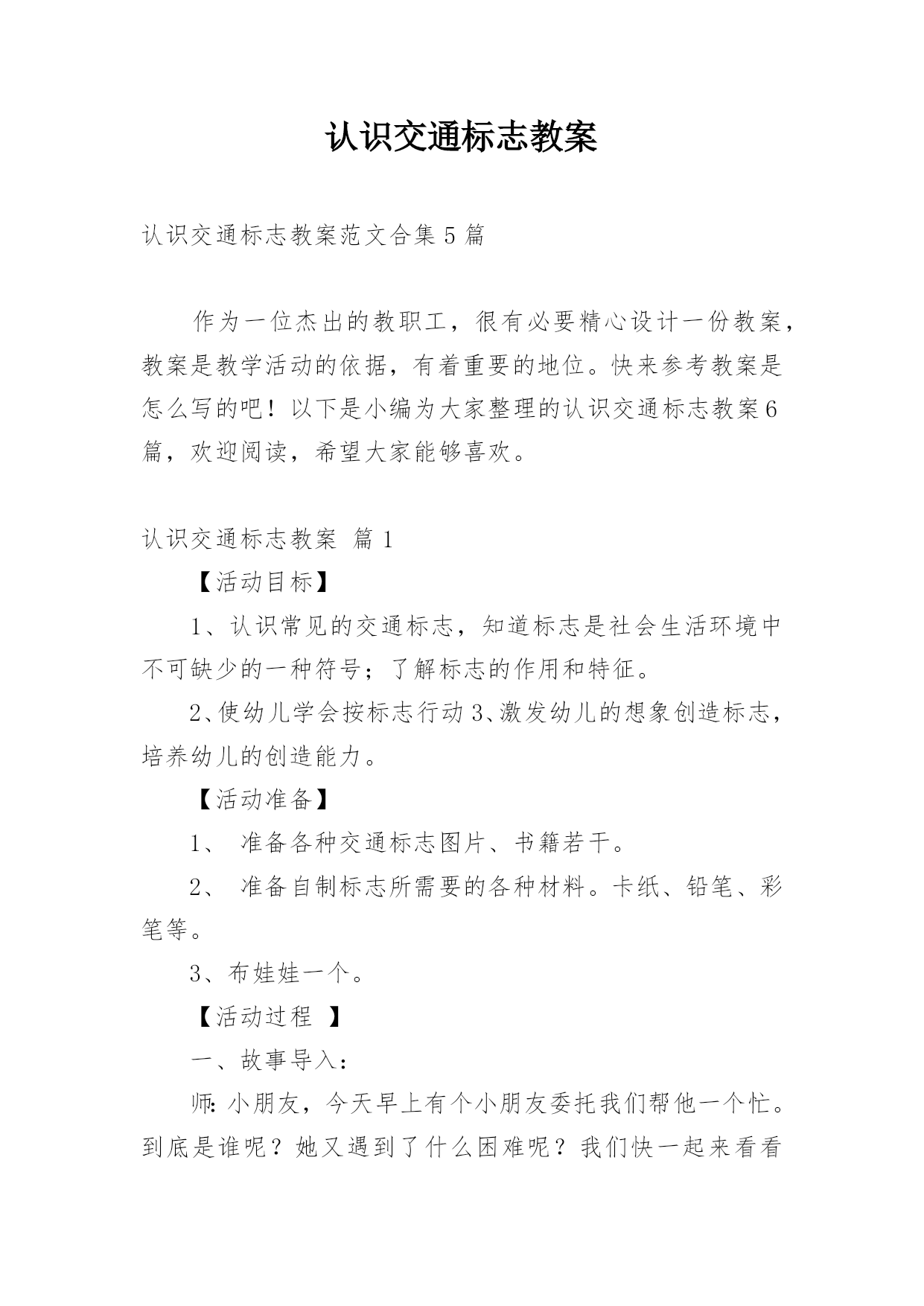 认识交通标志教案认识交通标志教案范文合集5篇作为一位杰出的教职工,很有必要精心设计一份教案,教案是教学活动的依据,有着重要的地位。快来参考教案是怎么写的吧!以下是小编为大家整理的认识交通标志教案6篇,欢迎阅读,希望大家能够喜欢。认识交通标志教案篇1【活动目标】1、认识常见的交通标志,知道标志是社会生活环境中不可缺少的一种符号;了解标志的作用和特征。2、使幼儿学会按标志行动3、激发幼儿的想象创造标志,培养幼儿的创造能力。【活动准备】1、准备各种交通标志图片、书籍若干。2、准备自制标志所需要的各种材料。卡纸、