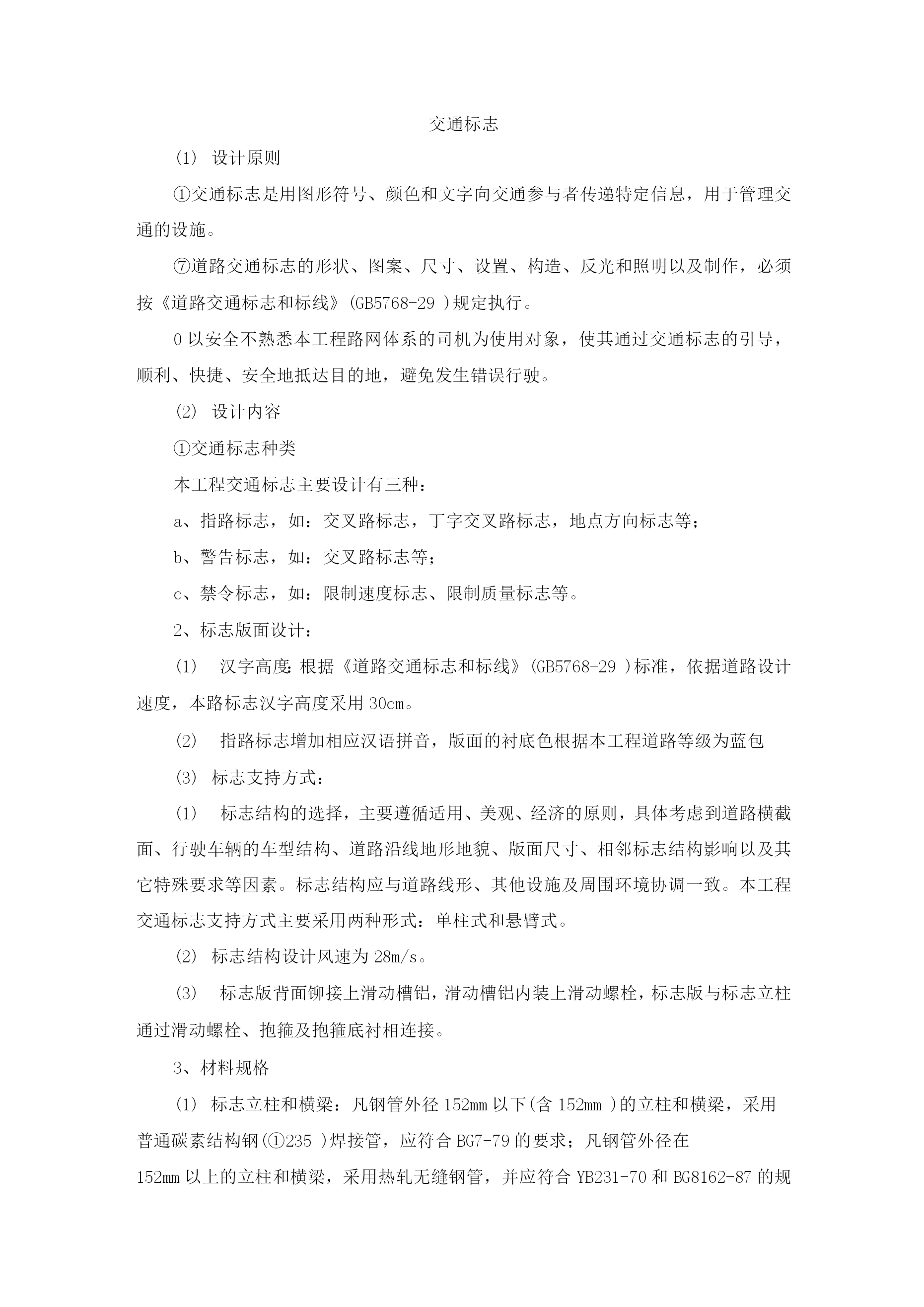 交通标志设计原则①交通标志是用图形符号、颜色和文字向交通参与者传递特定信息,用于管理交通的设施。⑦道路交通标志的形状、图案、尺寸、设置、构造、反光和照明以及制作,必须按《道路交通标志和标线》(GB5768-29)规定执行。0以安全不熟悉本工程路网体系的司机为使用对象,使其通过交通标志的引导,顺利、快捷、安全地抵达目的地,避免发生错误行驶。设计内容①交通标志种类本工程交通标志主要设计有三种:a、指路标志,如:交叉路标志,丁字交叉路标志,地点方向标志等;b、警告标志,如:交叉路标志等;c、禁令标志,如:限制速