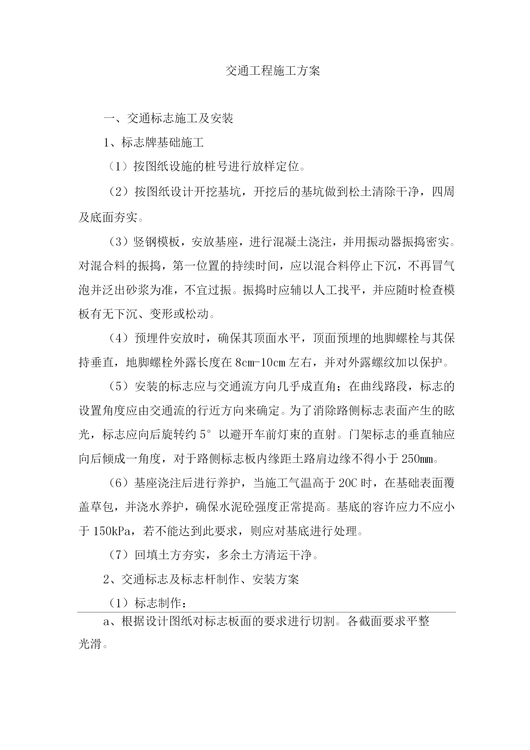 交通工程施工方案一、交通标志施工及安装1、标志牌基础施工(1)按图纸设施的桩号进行放样定位。(2)按图纸设计开挖基坑,开挖后的基坑做到松土清除干净,四周及底面夯实。(3)竖钢模板,安放基座,进行混凝土浇注,并用振动器振捣密实。对混合料的振捣,第一位置的持续时间,应以混合料停止下沉,不再冒气泡并泛出砂浆为准,不宜过振。振捣时应辅以人工找平,并应随时检查模板有无下沉、变形或松动。(4)预埋件安放时,确保其顶面水平,顶面预埋的地脚螺栓与其保持垂直,地脚螺栓外露长度在8cm-10cm左右,并对外露螺纹加以保护。(