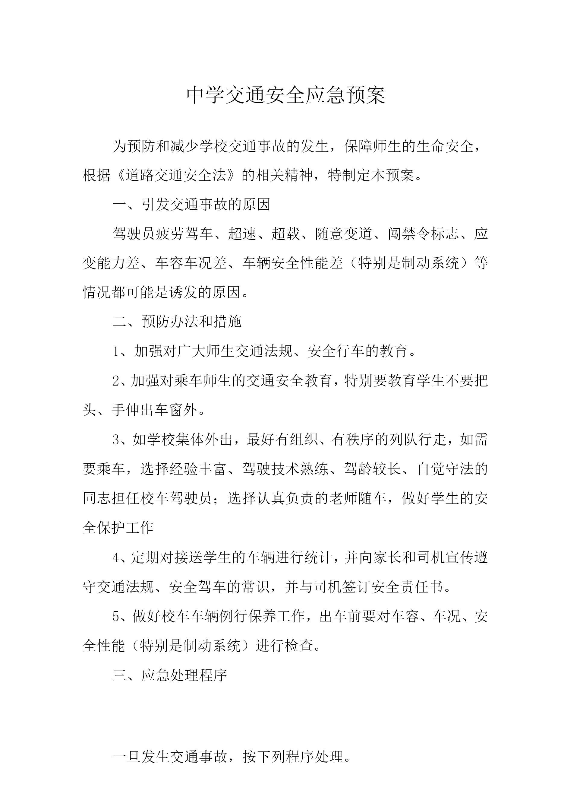 中学交通安全应急预案为预防和减少学校交通事故的发生,保障师生的生命安全,根据《道路交通安全法》的相关精神,特制定本预案。一、引发交通事故的原因驾驶员疲劳驾车、超速、超载、随意变道、闯禁令标志、应变能力差、车容车况差、车辆安全性能差(特别是制动系统)等情况都可能是诱发的原因。二、预防办法和措施1、加强对广大师生交通法规、安全行车的教育。2、加强对乘车师生的交通安全教育,特别要教育学生不要把头、手伸出车窗外。3、如学校集体外出,最好有组织、有秩序的列队行走,如需要乘车,选择经验丰富、驾驶技术熟练、驾龄较长、自