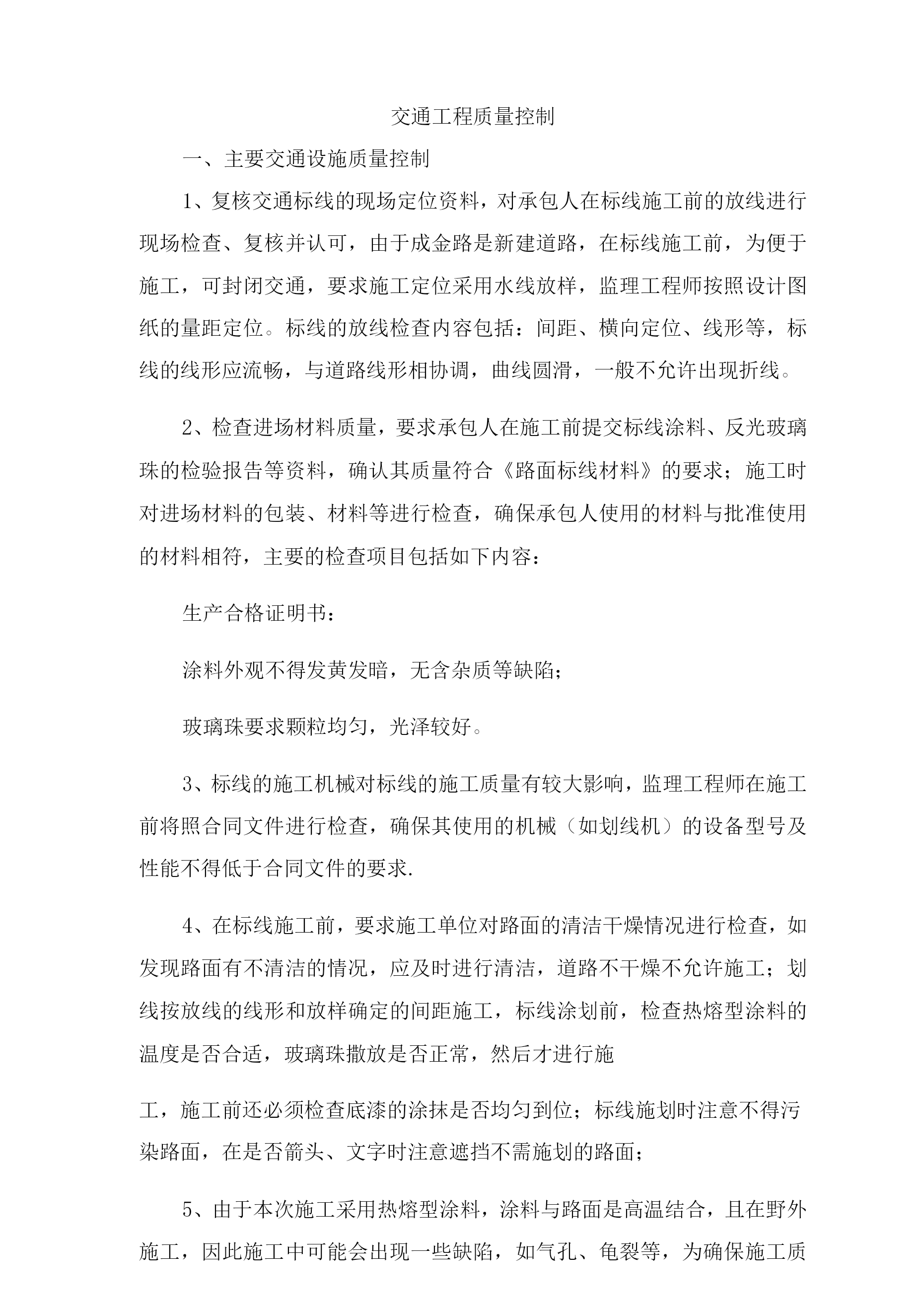 交通工程质量控制一、主要交通设施质量控制1、复核交通标线的现场定位资料,对承包人在标线施工前的放线进行现场检查、复核并认可,由于成金路是新建道路,在标线施工前,为便于施工,可封闭交通,要求施工定位采用水线放样,监理工程师按照设计图纸的量距定位。标线的放线检查内容包括:间距、横向定位、线形等,标线的线形应流畅,与道路线形相协调,曲线圆滑,一般不允许出现折线。2、检查进场材料质量,要求承包人在施工前提交标线涂料、反光玻璃珠的检验报告等资料,确认其质量符合《路面标线材料》的要求;施工时对进场材料的包装、材料等进