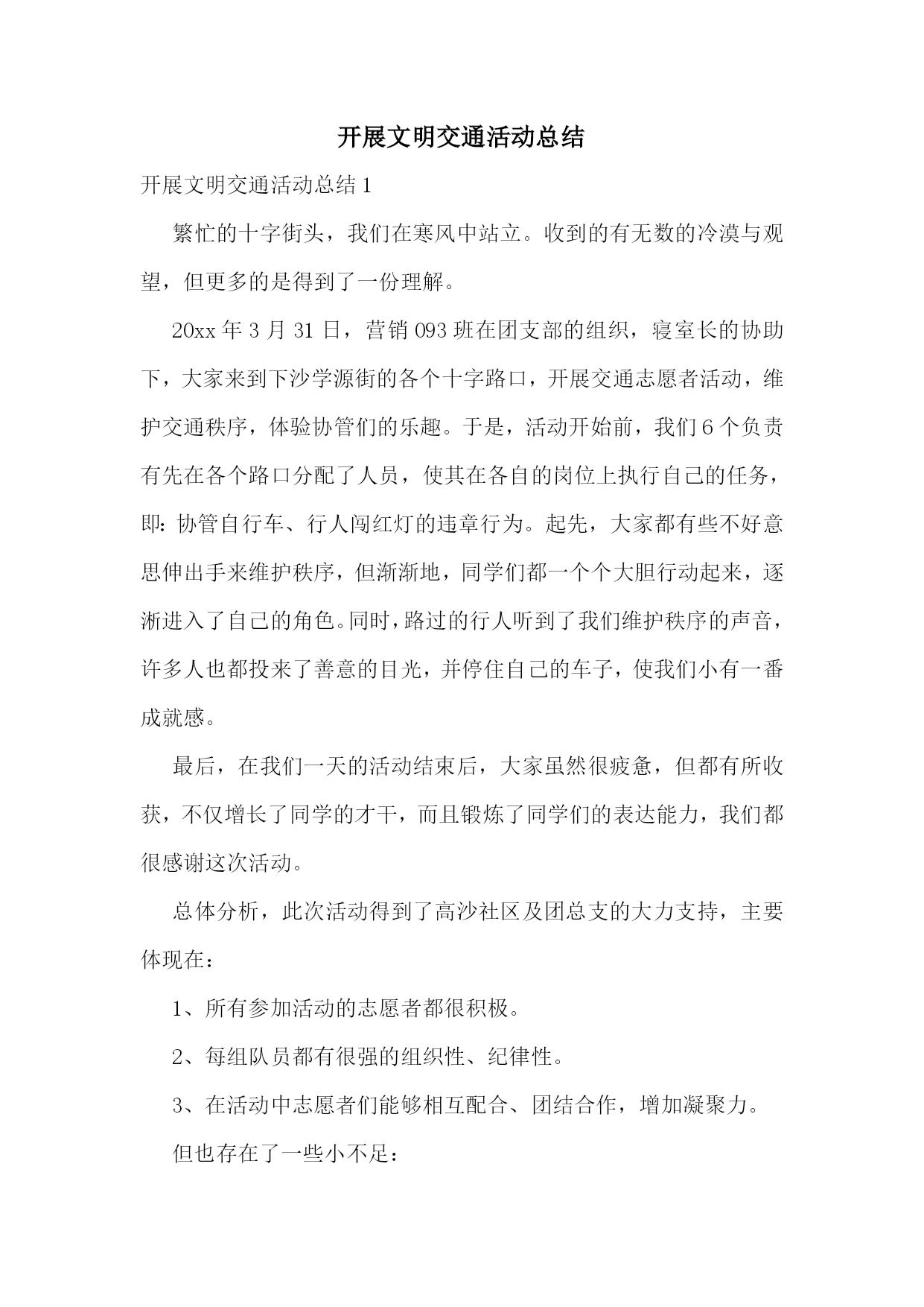 开展文明交通活动总结开展文明交通活动总结1繁忙的十字街头,我们在寒风中站立。收到的有无数的冷漠与观望,但更多的是得到了一份理解。20xx年3月31日,营销093班在团支部的组织,寝室长的协助下,大家来到下沙学源街的各个十字路口,开展交通志愿者活动,维护交通秩序,体验协管们的乐趣。于是,活动开始前,我们6个负责有先在各个路口分配了人员,使其在各自的岗位上执行自己的任务,即:协管自行车、行人闯红灯的违章行为。起先,大家都有些不好意思伸出手来维护秩序,但渐渐地,同学们都一个个大胆行动起来,逐淅进入了自己的角色。