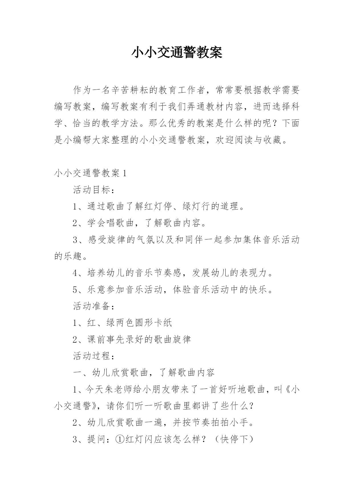 小小交通警教案作为一名辛苦耕耘的教育工作者,常常要根据教学需要编写教案,编写教案有利于我们弄通教材内容,进而选择科学、恰当的教学方法。那么优秀的教案是什么样的呢?下面是小编帮大家整理的小小交通警教案,欢迎阅读与收藏。小小交通警教案1活动目标:1、通过歌曲了解红灯停、绿灯行的道理。2、学会唱歌曲,了解歌曲内容。3、感受旋律的气氛以及和同伴一起参加集体音乐活动的乐趣。4、培养幼儿的音乐节奏感,发展幼儿的表现力。5、乐意参加音乐活动,体验音乐活动中的快乐。活动准备:1、红、绿两色圆形卡纸2、课前事先录好的歌曲旋
