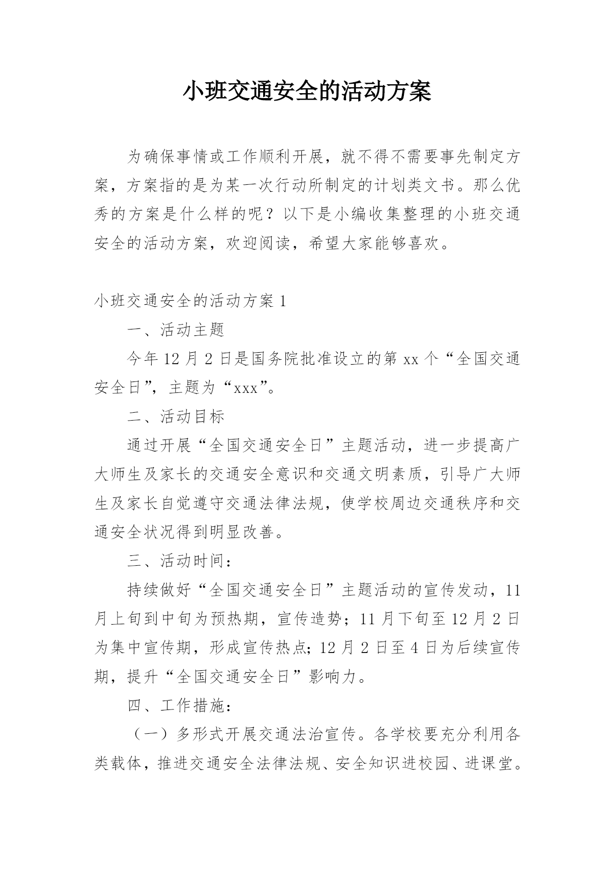 小班交通安全的活动方案为确保事情或工作顺利开展,就不得不需要事先制定方案,方案指的是为某一次行动所制定的计划类文书。那么优秀的方案是什么样的呢?以下是小编收集整理的小班交通安全的活动方案,欢迎阅读,希望大家能够喜欢。小班交通安全的活动方案1一、活动主题今年12月2日是国务院批准设立的第xx个“全国交通安全日”,主题为“xxx”。二、活动目标通过开展“全国交通安全日”主题活动,进一步提高广大师生及家长的交通安全意识和交通文明素质,引导广大师生及家长自觉遵守交通法律法规,使学校周边交通秩序和交通安全状况得到明