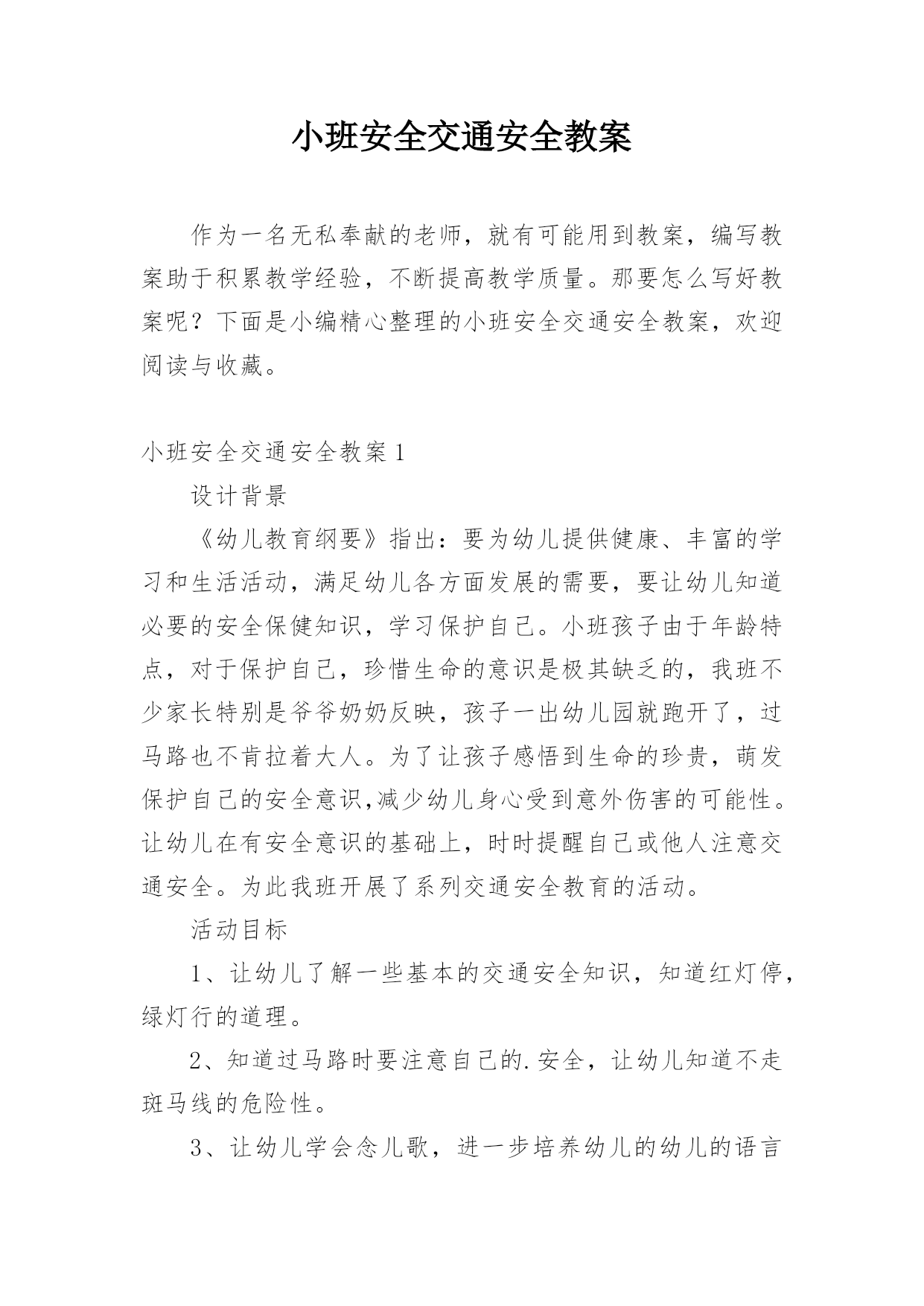 小班安全交通安全教案作为一名无私奉献的老师,就有可能用到教案,编写教案助于积累教学经验,不断提高教学质量。那要怎么写好教案呢?下面是小编精心整理的小班安全交通安全教案,欢迎阅读与收藏。小班安全交通安全教案1设计背景《幼儿教育纲要》指出:要为幼儿提供健康、丰富的学习和生活活动,满足幼儿各方面发展的需要,要让幼儿知道必要的安全保健知识,学习保护自己。小班孩子由于年龄特点,对于保护自己,珍惜生命的意识是极其缺乏的,我班不少家长特别是爷爷奶奶反映,孩子一出幼儿园就跑开了,过马路也不肯拉着大人。为了让孩子感悟到生命