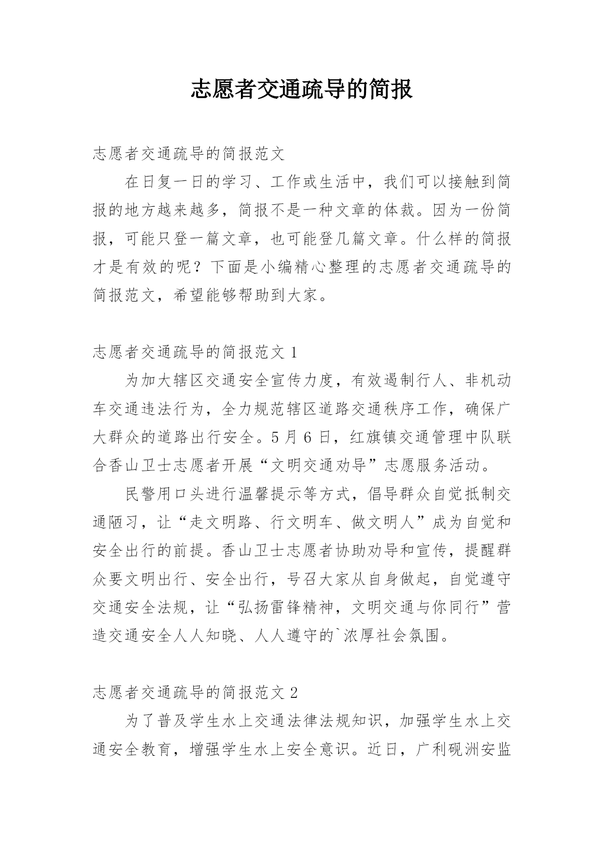 志愿者交通疏导的简报志愿者交通疏导的简报范文在日复一日的学习、工作或生活中,我们可以接触到简报的地方越来越多,简报不是一种文章的体裁。因为一份简报,可能只登一篇文章,也可能登几篇文章。什么样的简报才是有效的呢?下面是小编精心整理的志愿者交通疏导的简报范文,希望能够帮助到大家。志愿者交通疏导的简报范文1为加大辖区交通安全宣传力度,有效遏制行人、非机动车交通违法行为,全力规范辖区道路交通秩序工作,确保广大群众的道路出行安全。5月6日,红旗镇交通管理中队联合香山卫士志愿者开展“文明交通劝导”志愿服务活动。民警用