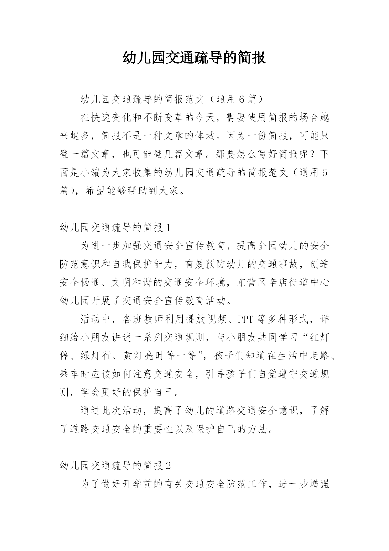 幼儿园交通疏导的简报幼儿园交通疏导的简报范文(通用6篇)在快速变化和不断变革的今天,需要使用简报的场合越来越多,简报不是一种文章的体裁。因为一份简报,可能只登一篇文章,也可能登几篇文章。那要怎么写好简报呢?下面是小编为大家收集的幼儿园交通疏导的简报范文(通用6篇),希望能够帮助到大家。幼儿园交通疏导的简报1为进一步加强交通安全宣传教育,提高全园幼儿的安全防范意识和自我保护能力,有效预防幼儿的交通事故,创造安全畅通、文明和谐的交通安全环境,东营区辛店街道中心幼儿园开展了交通安全宣传教育活动。活动中,各班教师