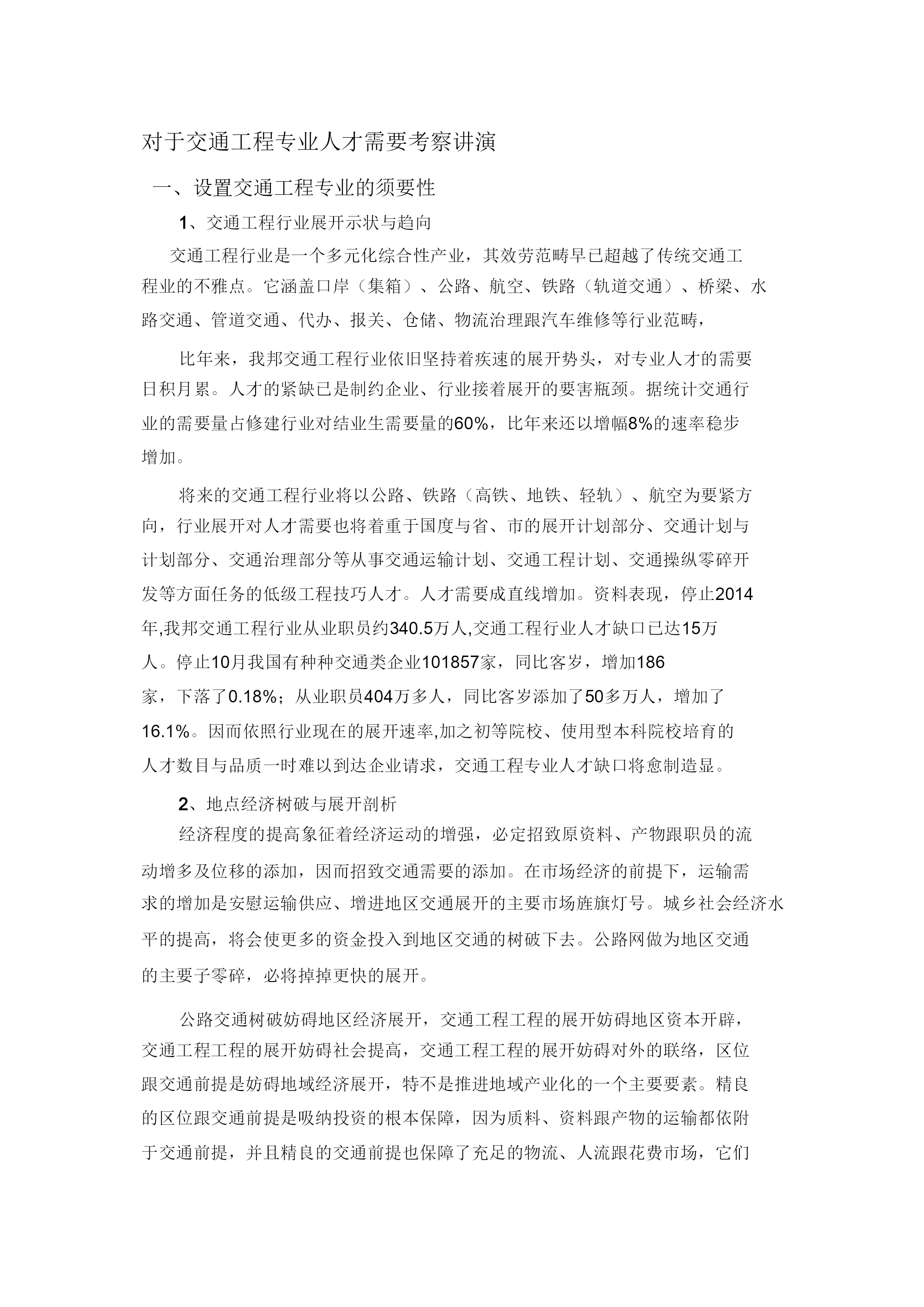 对于交通工程专业人才需要考察讲演一、设置交通工程专业的须要性1、交通工程行业展开示状与趋向交通工程行业是一个多元化综合性产业,其效劳范畴早已超越了传统交通工程业的不雅点。它涵盖口岸(集箱)、公路、航空、铁路(轨道交通)、桥梁、水路交通、管道交通、代办、报关、仓储、物流治理跟汽车维修等行业范畴,比年来,我邦交通工程行业依旧坚持着疾速的展开势头,对专业人才的需要日积月累。人才的紧缺已是制约企业、行业接着展开的要害瓶颈。据统计交通行业的需要量占修建行业对结业生需要量的60%,比年来还以增幅8%的速率稳步增加。将