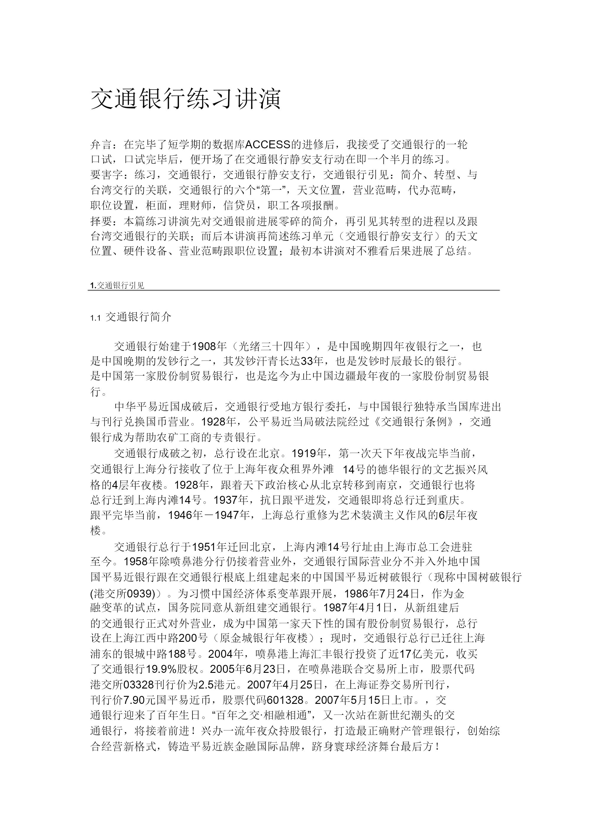 交通银行练习讲演弁言:在完毕了短学期的数据库ACCESS的进修后,我接受了交通银行的一轮口试,口试完毕后,便开场了在交通银行静安支行动在即一个半月的练习。要害字:练习,交通银行,交通银行静安支行,交通银行引见:简介、转型、与台湾交行的关联,交通银行的六个“第一”,天文位置,营业范畴,代办范畴,职位设置,柜面,理财师,信贷员,职工各项报酬。择要:本篇练习讲演先对交通银前进展零碎的简介,再引见其转型的进程以及跟台湾交通银行的关联;而后本讲演再简述练习单元(交通银行静安支行)的天文位置、硬件设备、营业范畴跟职位