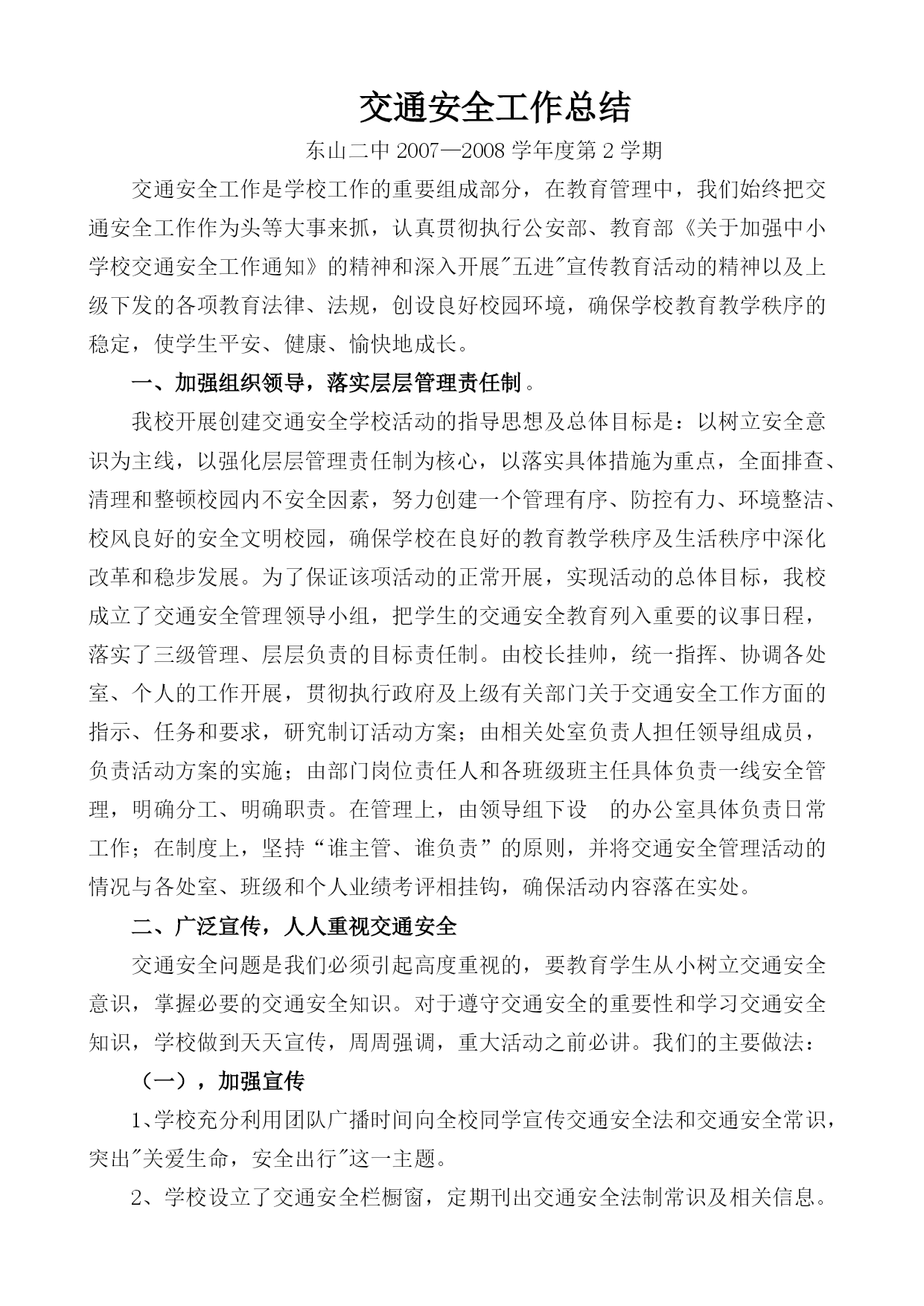 交通安全工作总结东山二中2007—2008学年度第2学期交通安全工作是学校工作的重要组成部分,在教育管理中,我们始终把交通安全工作作为头等大事来抓,认真贯彻执行公安部、教育部《关于加强中小学校交通安全工作通知》的精神和深入开展"五进"宣传教育活动的精神以及上级下发的各项教育法律、法规,创设良好校园环境,确保学校教育教学秩序的稳定,使学生平安、健康、愉快地成长。一、加强组织领导,落实层层管理责任制。我校开展创建交通安全学校活动的指导思想及总体目标是:以树立安全意识为主线,以强化层层管理责任制为核心,以落实具