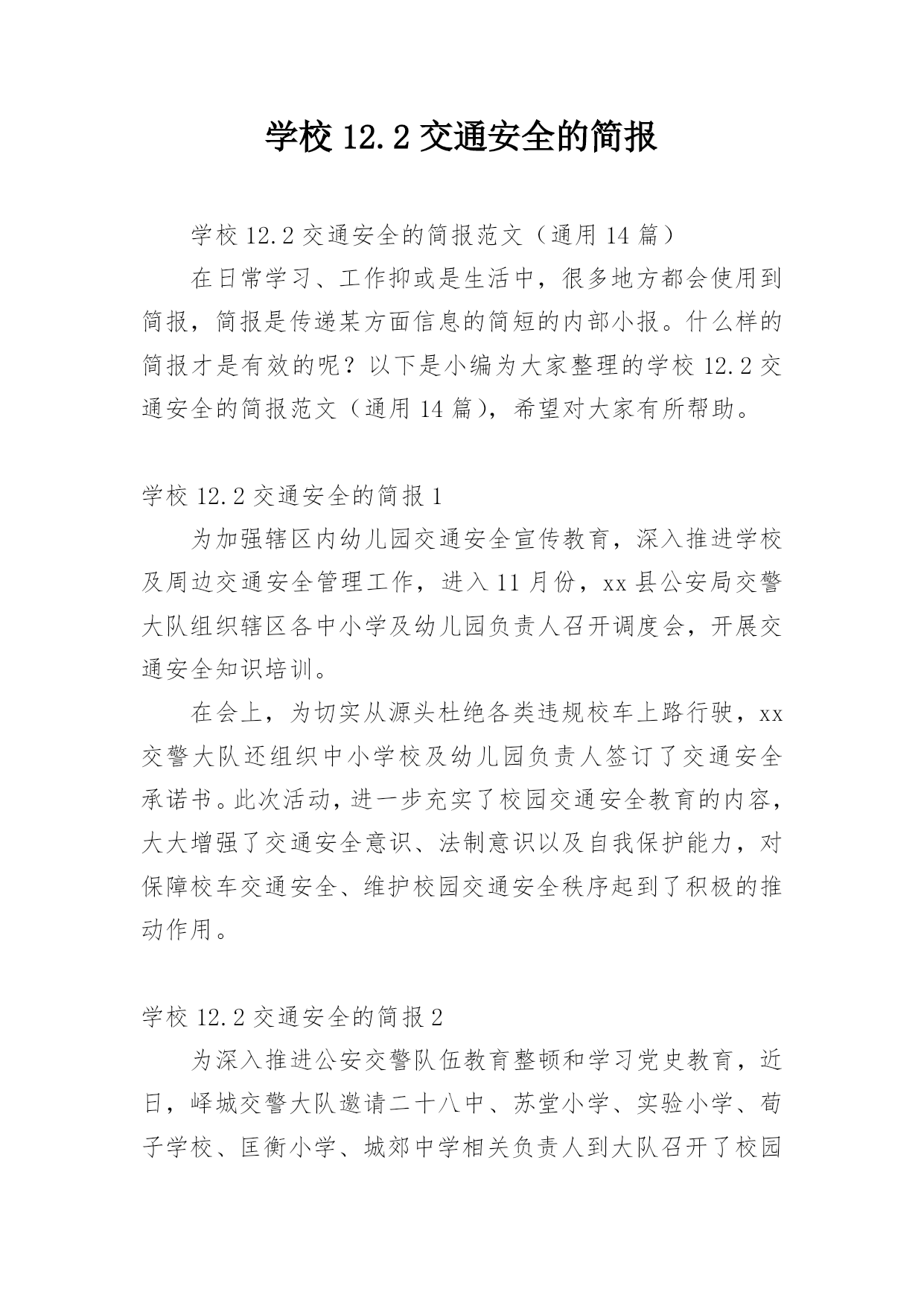 学校12.2交通安全的简报学校12.2交通安全的简报范文(通用14篇)在日常学习、工作抑或是生活中,很多地方都会使用到简报,简报是传递某方面信息的简短的内部小报。什么样的简报才是有效的呢?以下是小编为大家整理的学校12.2交通安全的简报范文(通用14篇),希望对大家有所帮助。学校12.2交通安全的简报1为加强辖区内幼儿园交通安全宣传教育,深入推进学校及周边交通安全管理工作,进入11月份,xx县公安局交警大队组织辖区各中小学及幼儿园负责人召开调度会,开展交通安全知识培训。在会上,为切实从源头杜绝各类违规校车