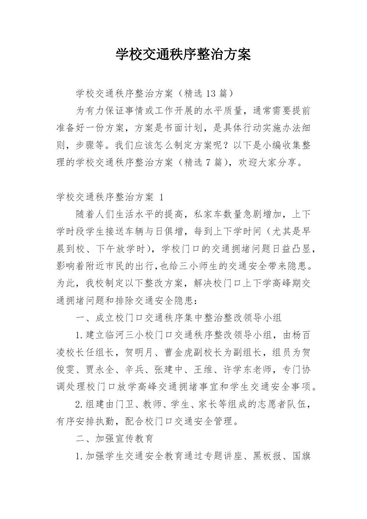 学校交通秩序整治方案学校交通秩序整治方案(精选13篇)为有力保证事情或工作开展的水平质量,通常需要提前准备好一份方案,方案是书面计划,是具体行动实施办法细则,步骤等。我们应该怎么制定方案呢?以下是小编收集整理的学校交通秩序整治方案(精选7篇),欢迎大家分享。学校交通秩序整治方案1随着人们生活水平的提高,私家车数量急剧增加,上下学时段学生接送车辆与日俱增,每到上下学时间(尤其是早晨到校、下午放学时),学校门口的交通拥堵问题日益凸显,影响着附近市民的出行,也给三小师生的交通安全带来隐患。为此,我校制定以下整改