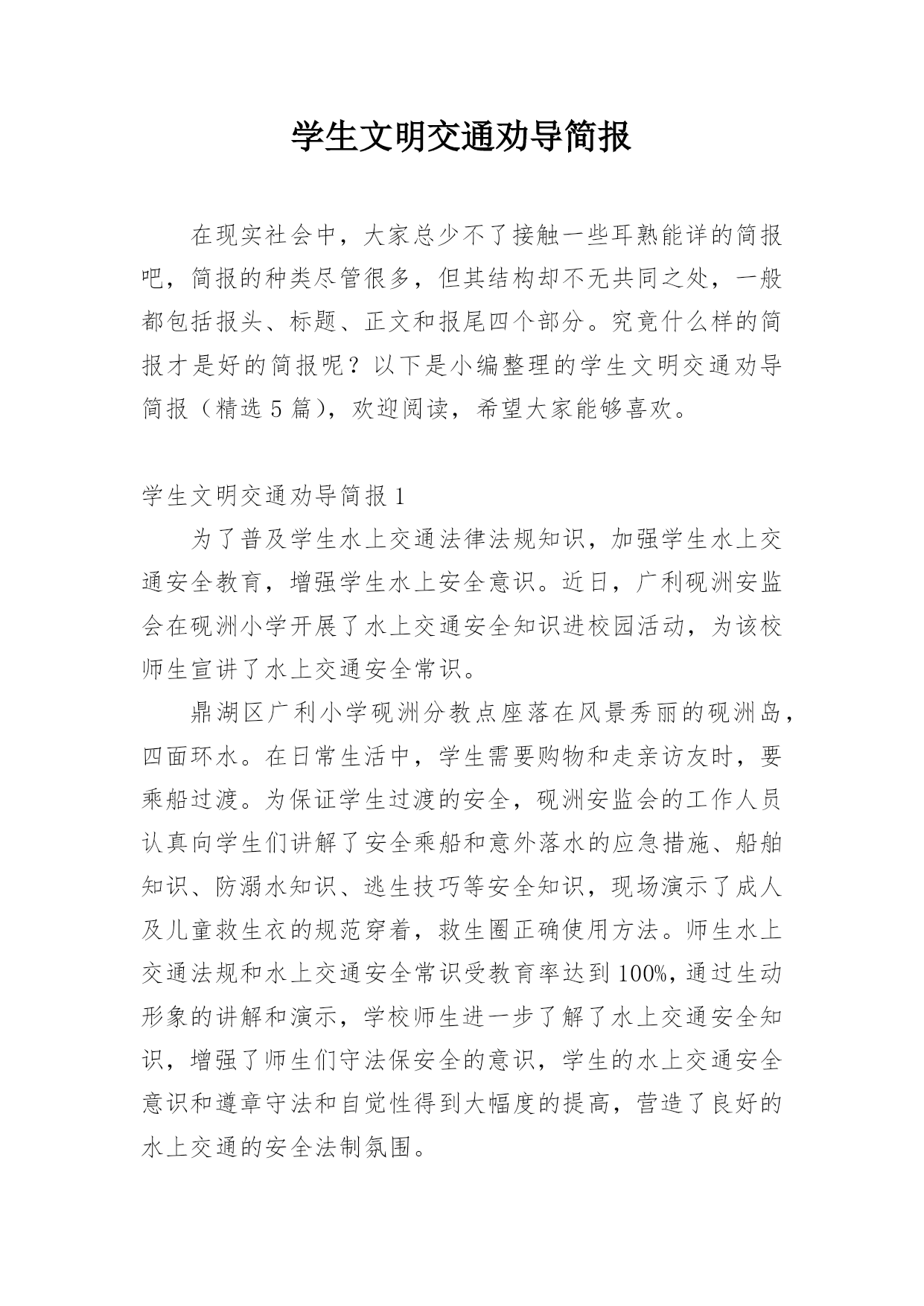 学生文明交通劝导简报在现实社会中,大家总少不了接触一些耳熟能详的简报吧,简报的种类尽管很多,但其结构却不无共同之处,一般都包括报头、标题、正文和报尾四个部分。究竟什么样的简报才是好的简报呢?以下是小编整理的学生文明交通劝导简报(精选5篇),欢迎阅读,希望大家能够喜欢。学生文明交通劝导简报1为了普及学生水上交通法律法规知识,加强学生水上交通安全教育,增强学生水上安全意识。近日,广利砚洲安监会在砚洲小学开展了水上交通安全知识进校园活动,为该校师生宣讲了水上交通安全常识。鼎湖区广利小学砚洲分教点座落在风景秀丽的