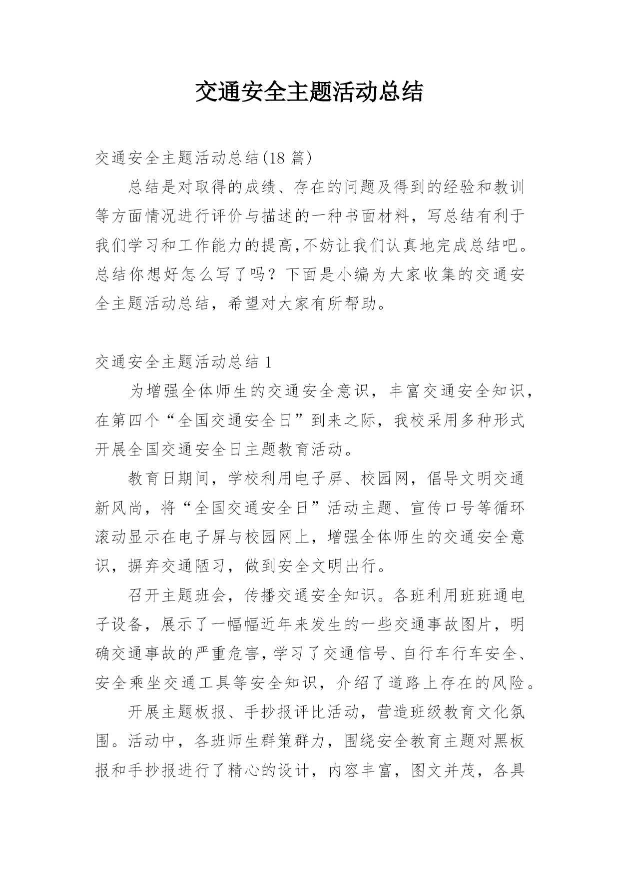 交通安全主题活动总结交通安全主题活动总结(18篇)总结是对取得的成绩、存在的问题及得到的经验和教训等方面情况进行评价与描述的一种书面材料,写总结有利于我们学习和工作能力的提高,不妨让我们认真地完成总结吧。总结你想好怎么写了吗?下面是小编为大家收集的交通安全主题活动总结,希望对大家有所帮助。交通安全主题活动总结1为增强全体师生的交通安全意识,丰富交通安全知识,在第四个“全国交通安全日”到来之际,我校采用多种形式开展全国交通安全日主题教育活动。教育日期间,学校利用电子屏、校园网,倡导文明交通新风尚,将“全国交