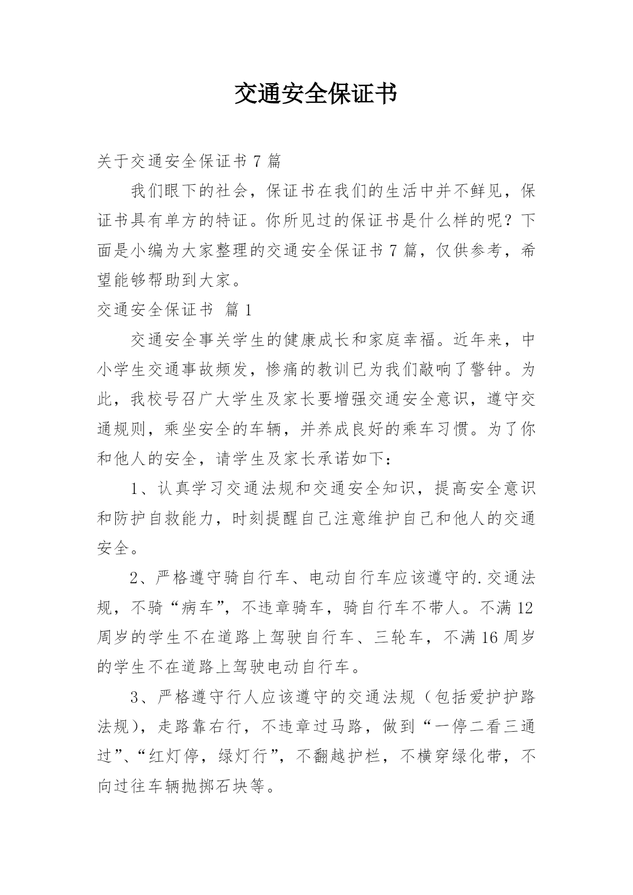 交通安全保证书关于交通安全保证书7篇我们眼下的社会,保证书在我们的生活中并不鲜见,保证书具有单方的特证。你所见过的保证书是什么样的呢?下面是小编为大家整理的交通安全保证书7篇,仅供参考,希望能够帮助到大家。交通安全保证书篇1交通安全事关学生的健康成长和家庭幸福。近年来,中小学生交通事故频发,惨痛的教训已为我们敲响了警钟。为此,我校号召广大学生及家长要增强交通安全意识,遵守交通规则,乘坐安全的车辆,并养成良好的乘车习惯。为了你和他人的安全,请学生及家长承诺如下:1、认真学习交通法规和交通安全知识,提高安全意
