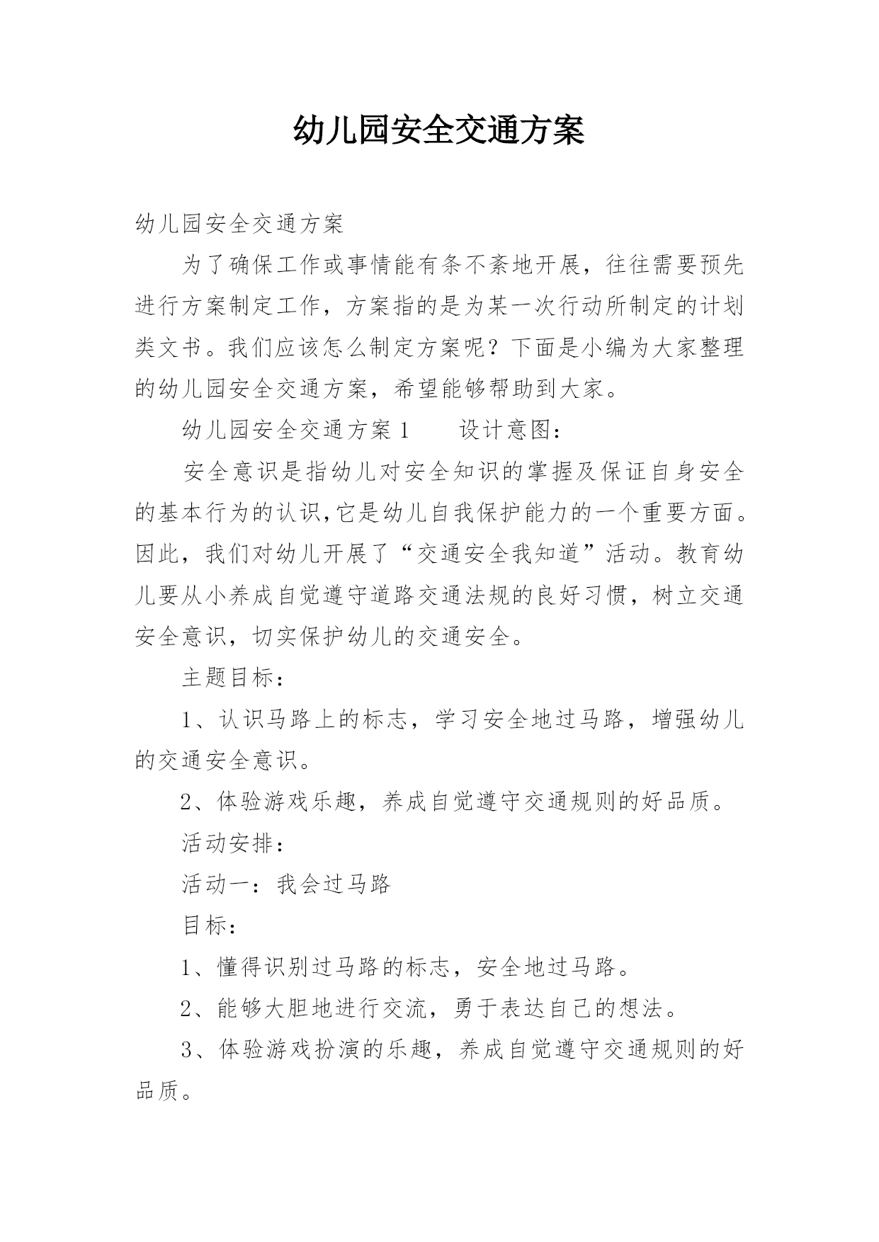 幼儿园安全交通方案幼儿园安全交通方案为了确保工作或事情能有条不紊地开展,往往需要预先进行方案制定工作,方案指的是为某一次行动所制定的计划类文书。我们应该怎么制定方案呢?下面是小编为大家整理的幼儿园安全交通方案,希望能够帮助到大家。幼儿园安全交通方案1设计意图:安全意识是指幼儿对安全知识的掌握及保证自身安全的基本行为的认识,它是幼儿自我保护能力的一个重要方面。因此,我们对幼儿开展了“交通安全我知道”活动。教育幼儿要从小养成自觉遵守道路交通法规的良好习惯,树立交通安全意识,切实保护幼儿的交通安全。主题目标:1
