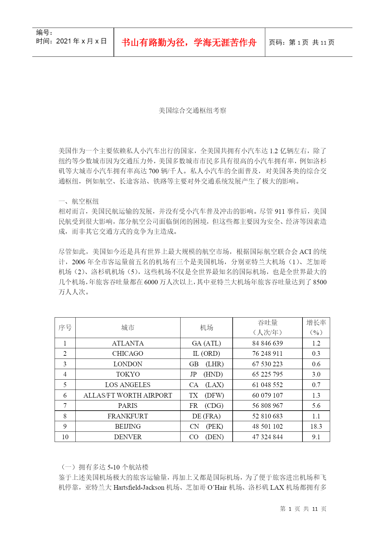 编号:时间:2021年x月x日书山有路勤为径,学海无涯苦作舟页码:第PAGE11页共NUMPAGES11页第PAGE\*MERGEFORMAT11页共NUMPAGES\*MERGEFORMAT11页美国综合交通枢纽考察美国作为一个主要依赖私人小汽车出行的国家,全美国共拥有小汽车达1.2亿辆左右,除了纽约等少数城市因为交通压力外,美国多数城市市民多具有很高的小汽车拥有率,例如洛杉矶等大城市小汽车拥有率高达700辆/千人。私人小汽车的全面普及,对美国各类的综合交通枢纽,例如航空、长途客