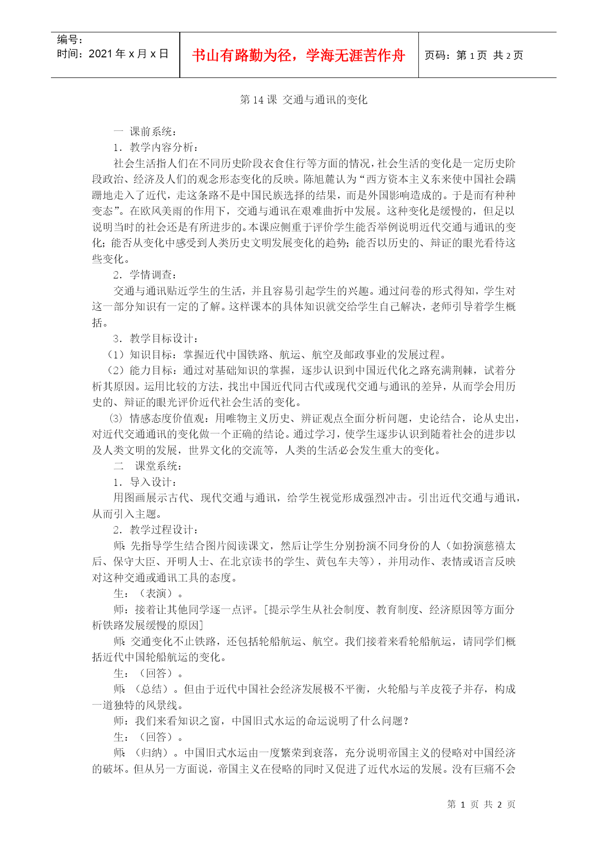编号:时间:2021年x月x日书山有路勤为径,学海无涯苦作舟页码:第PAGE2页共NUMPAGES2页第PAGE\*MERGEFORMAT2页共NUMPAGES\*MERGEFORMAT2页第14课交通与通讯的变化一课前系统:1.教学内容分析:社会生活指人们在不同历史阶段衣食住行等方面的情况,社会生活的变化是一定历史阶段政治、经济及人们的观念形态变化的反映。陈旭麓认为“西方资本主义东来使中国社会蹒跚地走入了近代,走这条路不是中国民族选择的结果,而是外国影响造成的。于是而有种种变态”