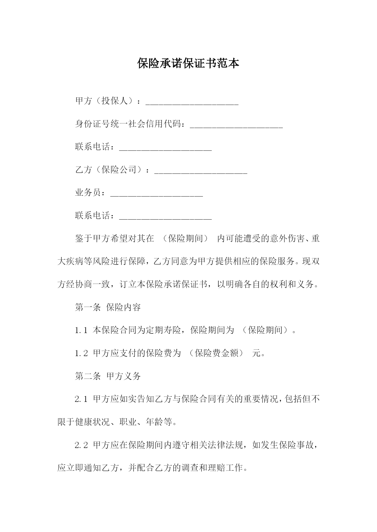 保险承诺保证书范本甲方(投保人):_____________________身份证号统一社会信用代码:_____________________联系电话:_____________________乙方(保险公司):_____________________业务员:_____________________联系电话:_____________________鉴于甲方希望对其在(保险期间)内可能遭受的意外伤害、重大疾病等风险进行保障,乙方同意为甲方提供相应的保险服务。现双方经协商一致,订立本保险承诺保证书,以