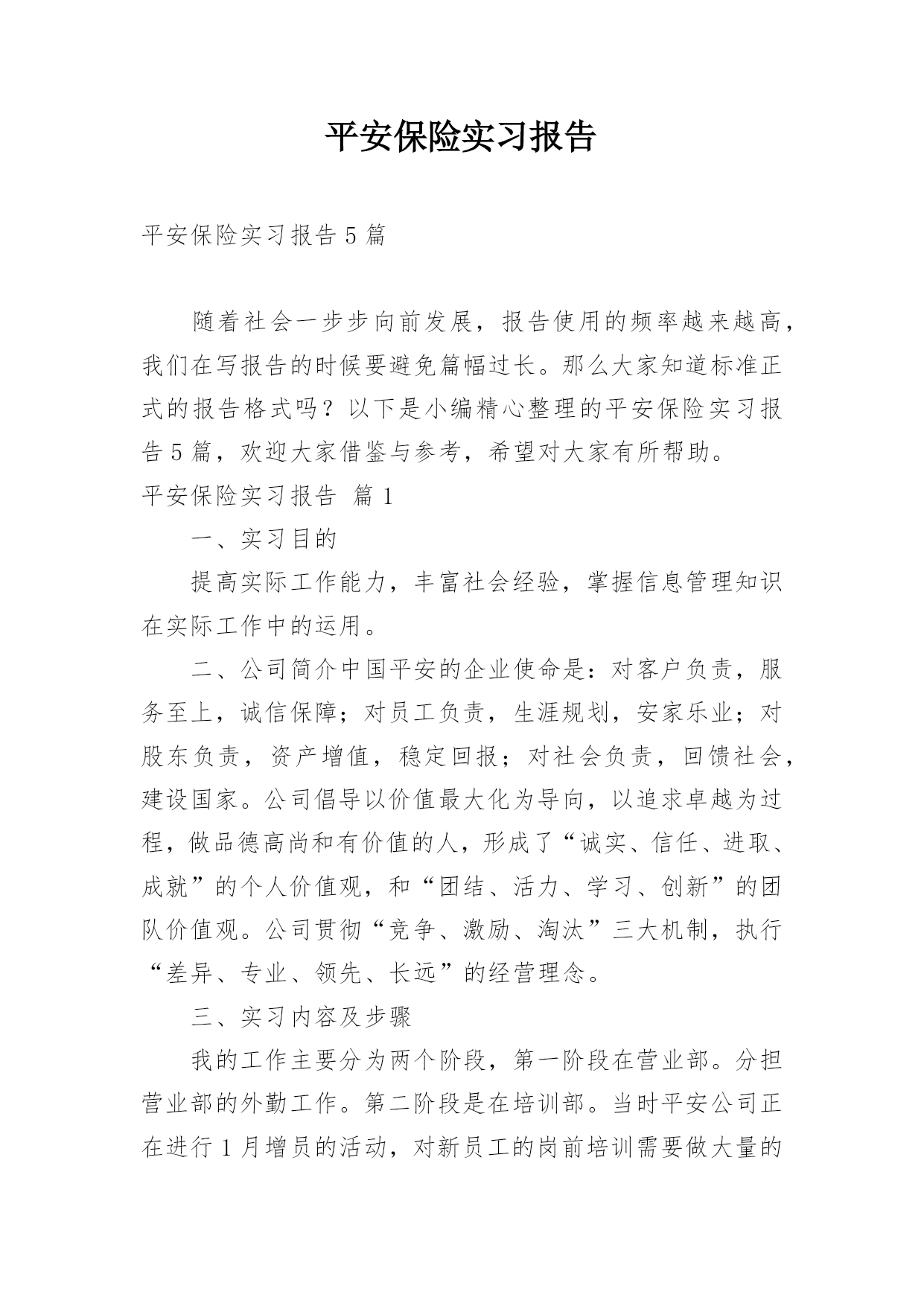 平安保险实习报告平安保险实习报告5篇随着社会一步步向前发展,报告使用的频率越来越高,我们在写报告的时候要避免篇幅过长。那么大家知道标准正式的报告格式吗?以下是小编精心整理的平安保险实习报告5篇,欢迎大家借鉴与参考,希望对大家有所帮助。平安保险实习报告篇1一、实习目的提高实际工作能力,丰富社会经验,掌握信息管理知识在实际工作中的运用。二、公司简介中国平安的企业使命是:对客户负责,服务至上,诚信保障;对员工负责,生涯规划,安家乐业;对股东负责,资产增值,稳定回报;对社会负责,回馈社会,建设国家。公司倡导以价值