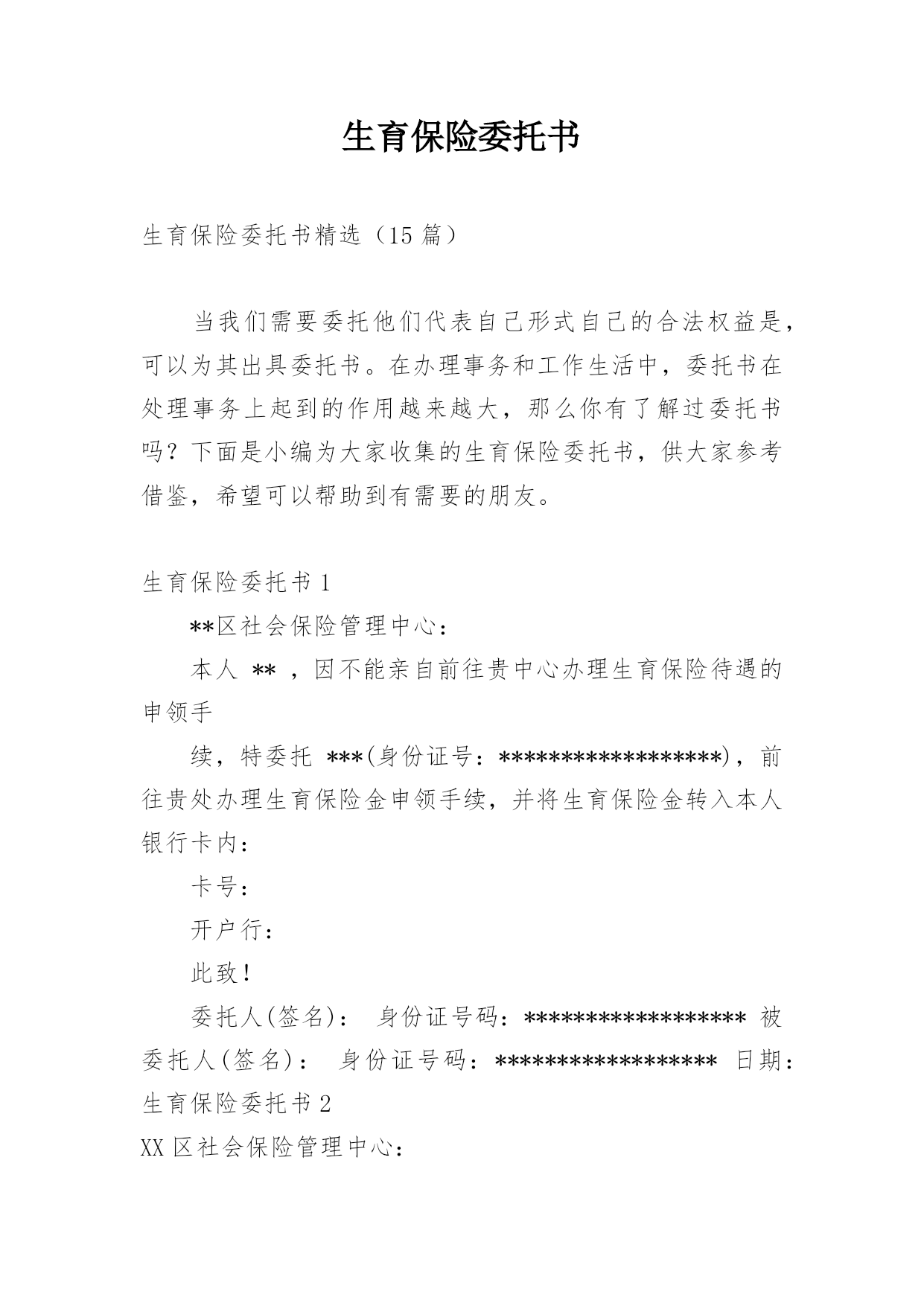 生育保险委托书生育保险委托书精选(15篇)当我们需要委托他们代表自己形式自己的合法权益是,可以为其出具委托书。在办理事务和工作生活中,委托书在处理事务上起到的作用越来越大,那么你有了解过委托书吗?下面是小编为大家收集的生育保险委托书,供大家参考借鉴,希望可以帮助到有需要的朋友。生育保险委托书1**区社会保险管理中心:本人**,因不能亲自前往贵中心办理生育保险待遇的申领手续,特委托***(身份证号:******************),前往贵处办理生育保险金申领手续,并将生育保险金转入本人银行卡内:卡号: