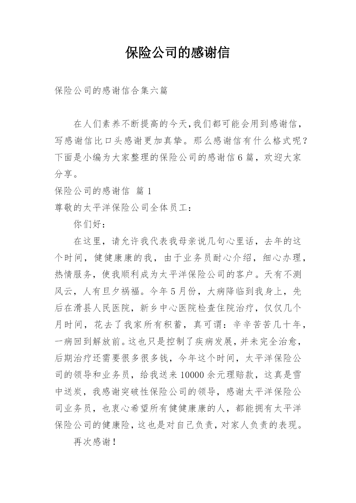 保险公司的感谢信保险公司的感谢信合集六篇在人们素养不断提高的今天,我们都可能会用到感谢信,写感谢信比口头感谢更加真挚。那么感谢信有什么格式呢?下面是小编为大家整理的保险公司的感谢信6篇,欢迎大家分享。保险公司的感谢信篇1尊敬的太平洋保险公司全体员工:你们好:在这里,请允许我代表我母亲说几句心里话,去年的这个时间,健健康康的我,由于业务员耐心介绍,细心办理,热情服务,使我顺利成为太平洋保险公司的客户。天有不测风云,人有旦夕祸福。今年5月份,大病降临到我身上,先后在滑县人民医院,新乡中心医院检查住院治疗,仅仅