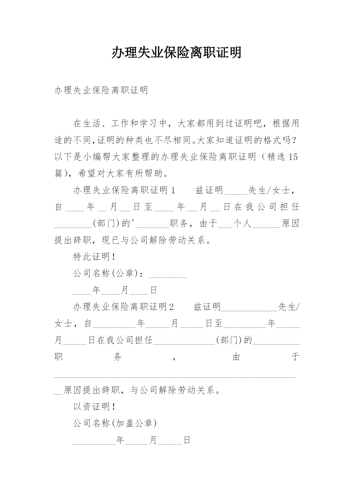办理失业保险离职证明办理失业保险离职证明在生活、工作和学习中,大家都用到过证明吧,根据用途的不同,证明的种类也不尽相同。大家知道证明的格式吗?以下是小编帮大家整理的办理失业保险离职证明(精选15篇),希望对大家有所帮助。办理失业保险离职证明1兹证明_____先生/女士,自____年__月__日至____年__月__日在我公司担任________(部门)的'_______职务,由于___个人______原因提出辞职,现已与公司解除劳动关系。特此证明!公司名称(公章):____________年____月__