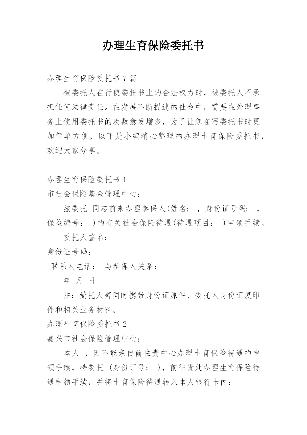 办理生育保险委托书办理生育保险委托书7篇被委托人在行使委托书上的合法权力时,被委托人不承担任何法律责任。在发展不断提速的社会中,需要在处理事务上使用委托书的次数愈发增多,为了让您在写委托书时更加简单方便,以下是小编精心整理的办理生育保险委托书,欢迎大家分享。办理生育保险委托书1市社会保险基金管理中心:兹委托同志前来办理参保人(姓名:,身份证号码:,保险编号:)的有关社会保险待遇(待遇项目:)申领手续。委托人签名:身份证号码:联系人电话:与参保人关系:年月日注:受托人需同时携带身份证原件、委托人身份证复印件