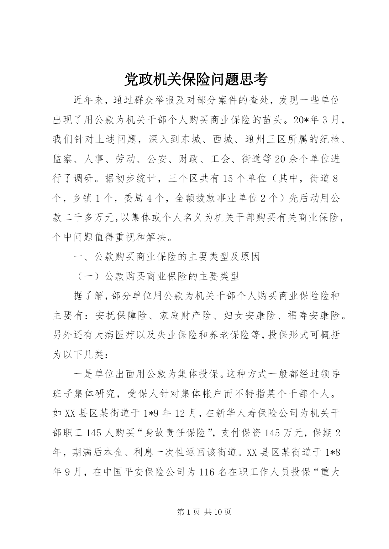 第PAGE\*Arabic\*MERGEFORMAT10页共NUMPAGES\*MERGEFORMAT10页党政机关保险问题思考近年来,通过群众举报及对部分案件的查处,发现一些单位出现了用公款为机关干部个人购买商业保险的苗头。20*年3月,我们针对上述问题,深入到东城、西城、通州三区所属的纪检、监察、人事、劳动、公安、财政、工会、街道等20余个单位进行了调研。据初步统计,三个区共有15个单位(其中,街道8个,乡镇1个,委局4个,全额拨款事业单位2个)先后动用公款二千多万元,以集体或个人名义为机