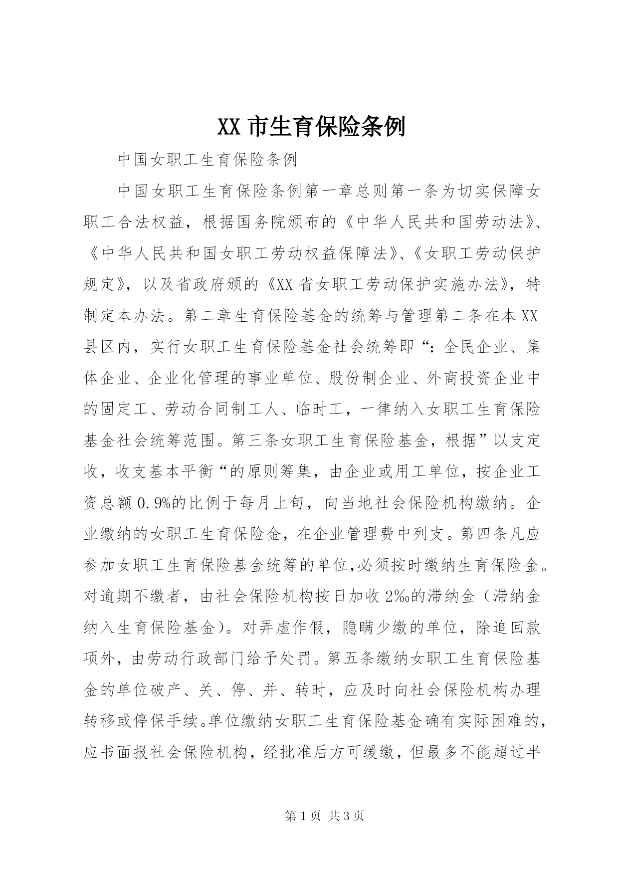 第PAGE\*Arabic\*MERGEFORMAT3页共NUMPAGES\*MERGEFORMAT3页XX市生育保险条例中国女职工生育保险条例中国女职工生育保险条例第一章总则第一条为切实保障女职工合法权益,根据国务院颁布的《中华人民共和国劳动法》、《中华人民共和国女职工劳动权益保障法》、《女职工劳动保护规定》,以及省政府颁的《XX省女职工劳动保护实施办法》,特制定本办法。第二章生育保险基金的统筹与管理第二条在本XX县区内,实行女职工生育保险基金社会统筹即“:全民企业、集体企业、企业化管理的事