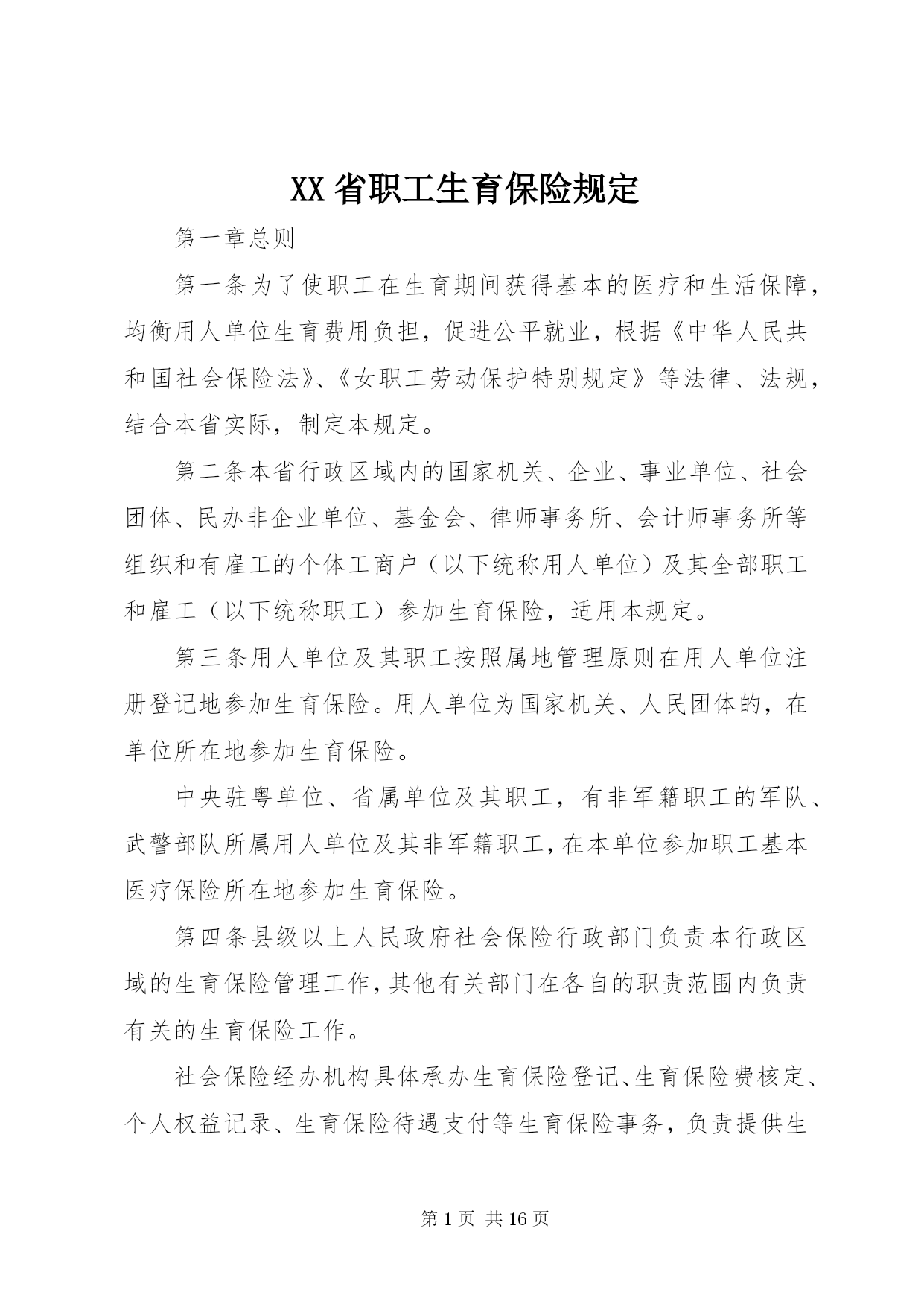 第PAGE\*Arabic\*MERGEFORMAT16页共NUMPAGES\*MERGEFORMAT16页XX省职工生育保险规定第一章总则第一条为了使职工在生育期间获得基本的医疗和生活保障,均衡用人单位生育费用负担,促进公平就业,根据《中华人民共和国社会保险法》、《女职工劳动保护特别规定》等法律、法规,结合本省实际,制定本规定。第二条本省行政区域内的国家机关、企业、事业单位、社会团体、民办非企业单位、基金会、律师事务所、会计师事务所等组织和有雇工的个体工商户(以下统称用人单位)及其全部职工和