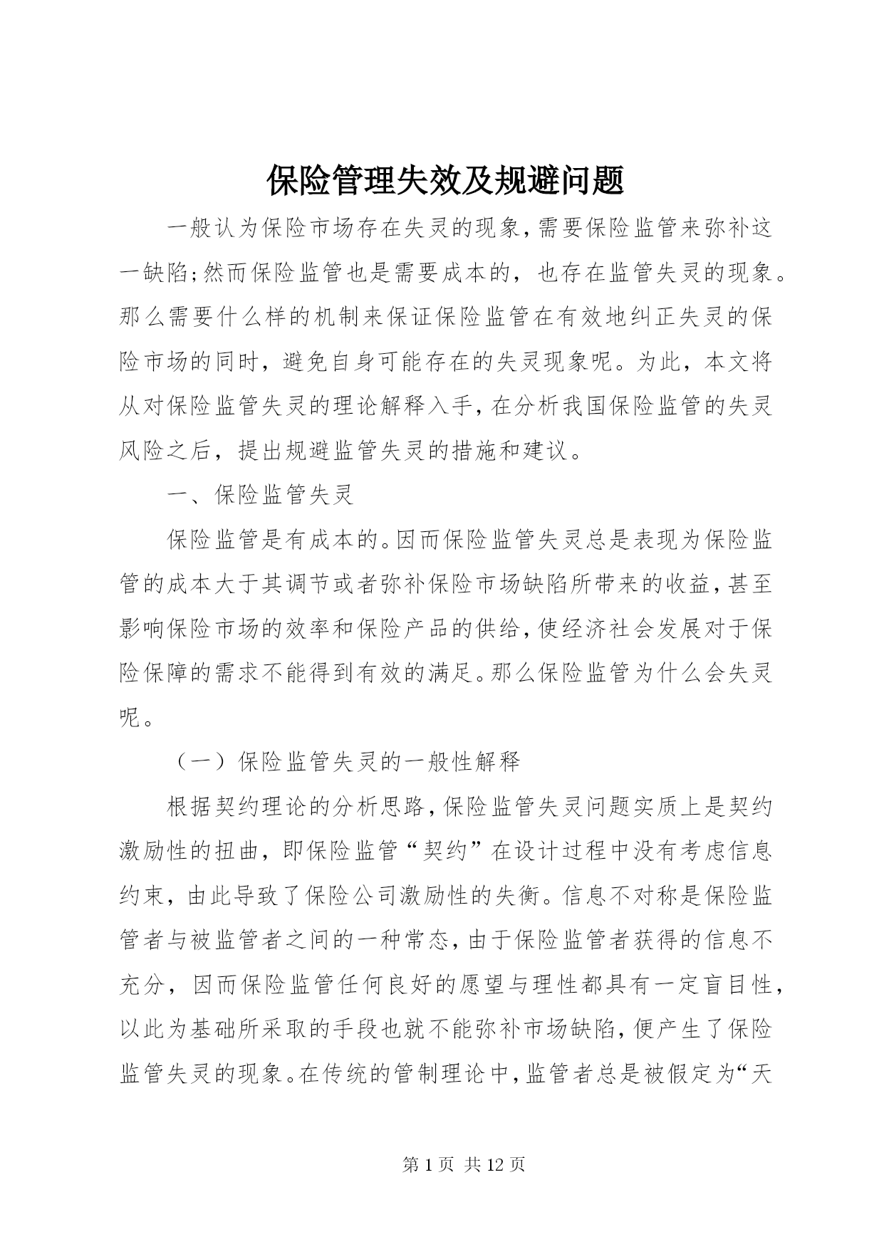 第PAGE\*Arabic\*MERGEFORMAT12页共NUMPAGES\*MERGEFORMAT12页保险管理失效及规避问题一般认为保险市场存在失灵的现象,需要保险监管来弥补这一缺陷;然而保险监管也是需要成本的,也存在监管失灵的现象。那么需要什么样的机制来保证保险监管在有效地纠正失灵的保险市场的同时,避免自身可能存在的失灵现象呢。为此,本文将从对保险监管失灵的理论解释入手,在分析我国保险监管的失灵风险之后,提出规避监管失灵的措施和建议。一、保险监管失灵保险监管是有成本的。因而保险监管失灵