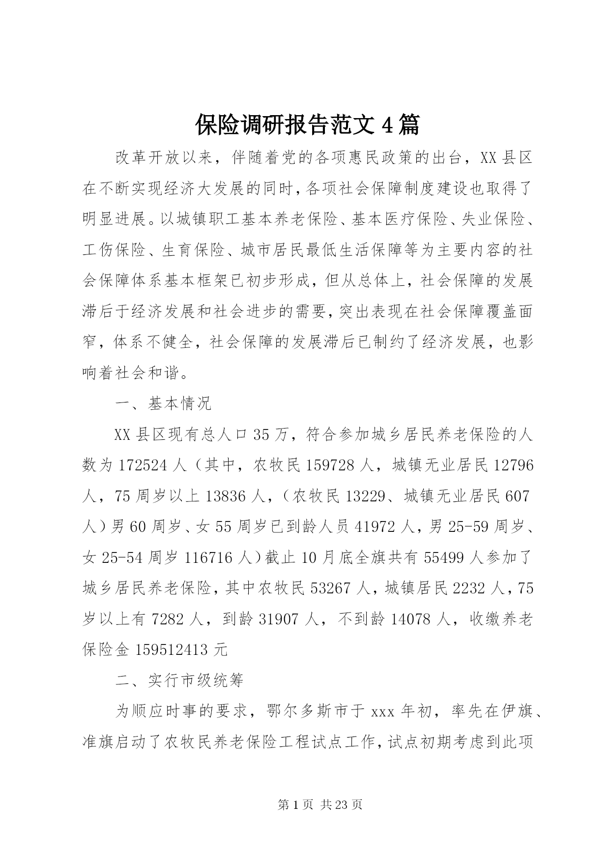 第PAGE\*Arabic\*MERGEFORMAT23页共NUMPAGES\*MERGEFORMAT23页保险调研报告范文4篇改革开放以来,伴随着党的各项惠民政策的出台,XX县区在不断实现经济大发展的同时,各项社会保障制度建设也取得了明显进展。以城镇职工基本养老保险、基本医疗保险、失业保险、工伤保险、生育保险、城市居民最低生活保障等为主要内容的社会保障体系基本框架已初步形成,但从总体上,社会保障的发展滞后于经济发展和社会进步的需要,突出表现在社会保障覆盖面窄,体系不健全,社会保障的发展滞后已