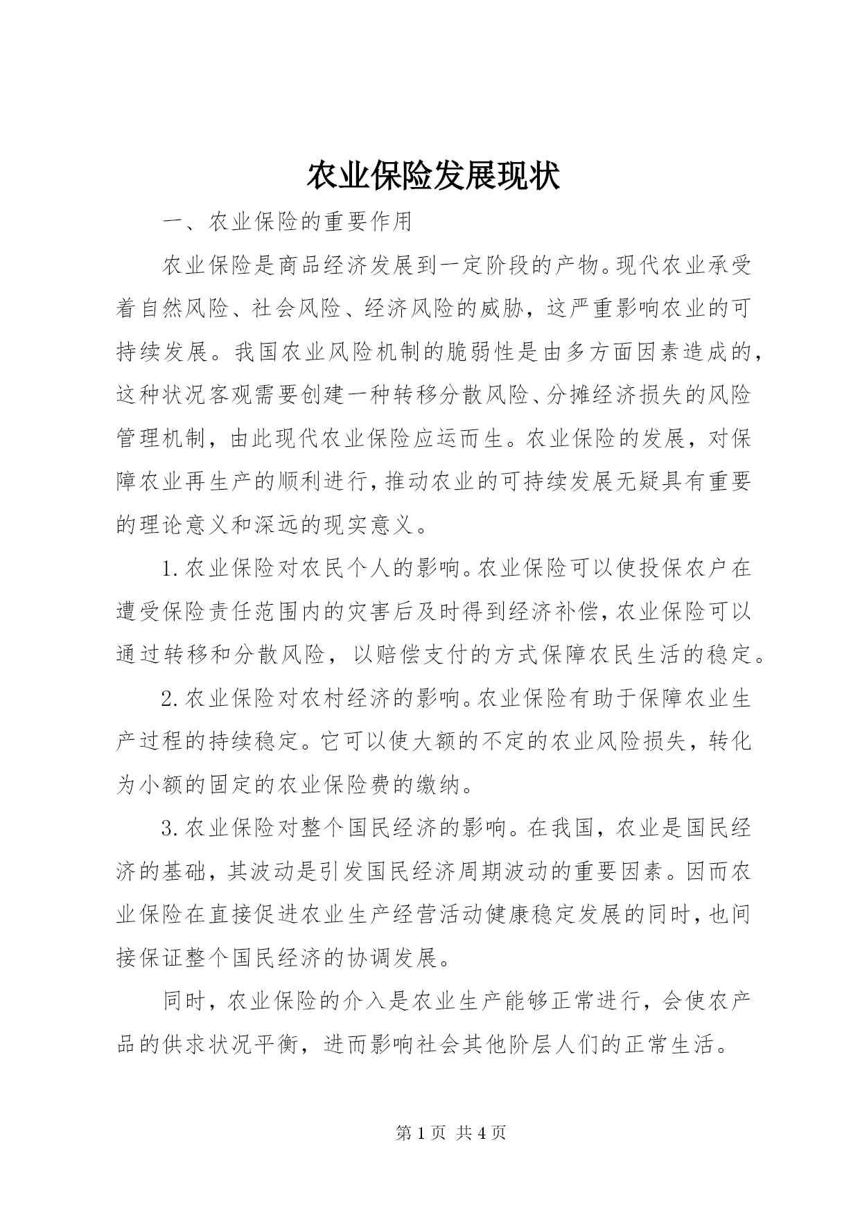 第PAGE\*Arabic\*MERGEFORMAT4页共NUMPAGES\*MERGEFORMAT4页农业保险发展现状一、农业保险的重要作用农业保险是商品经济发展到一定阶段的产物。现代农业承受着自然风险、社会风险、经济风险的威胁,这严重影响农业的可持续发展。我国农业风险机制的脆弱性是由多方面因素造成的,这种状况客观需要创建一种转移分散风险、分摊经济损失的风险管理机制,由此现代农业保险应运而生。农业保险的发展,对保障农业再生产的顺利进行,推动农业的可持续发展无疑具有重要的理论意义和深远的现实意
