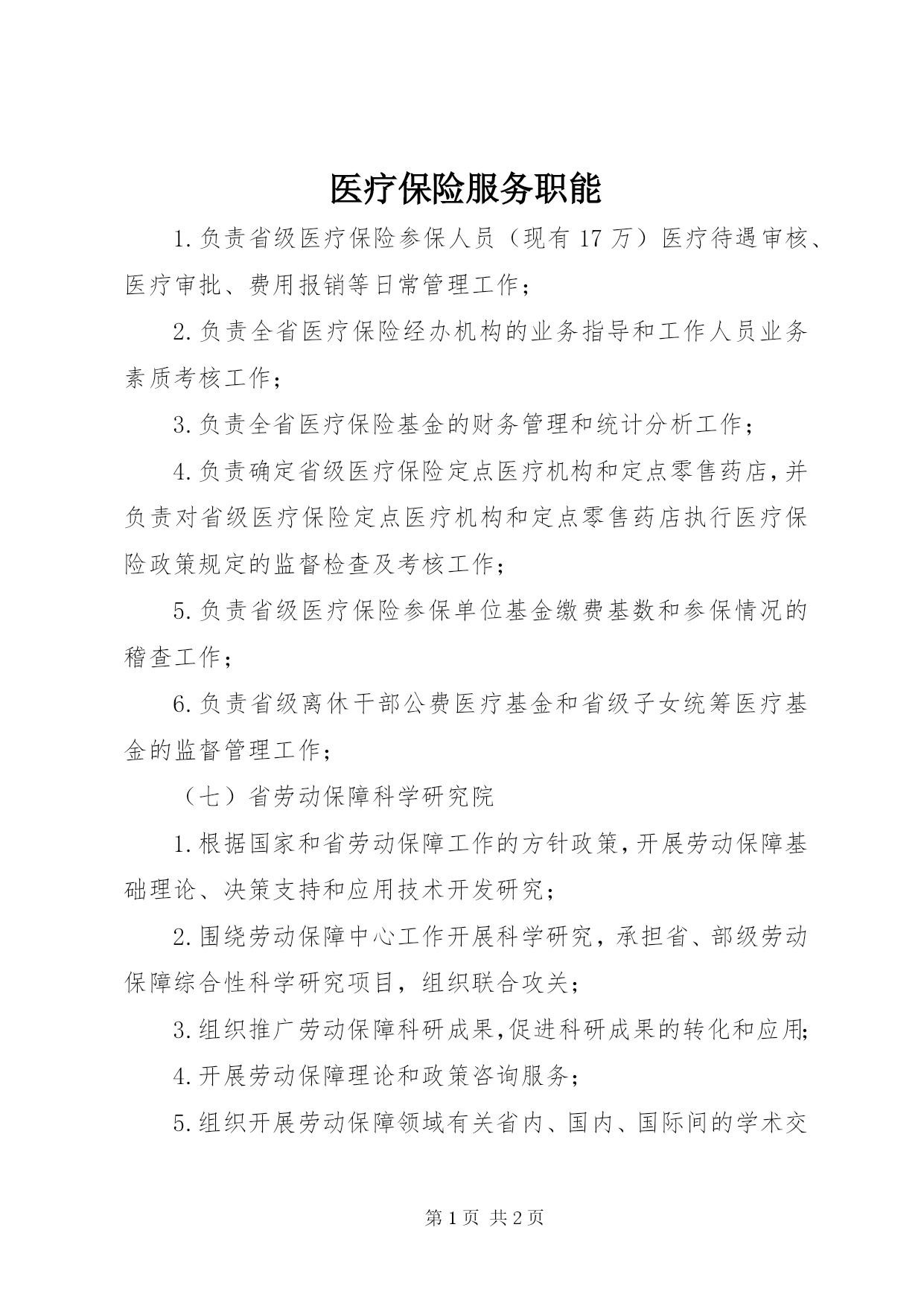 第PAGE\*Arabic\*MERGEFORMAT2页共NUMPAGES\*MERGEFORMAT2页医疗保险服务职能1.负责省级医疗保险参保人员(现有17万)医疗待遇审核、医疗审批、费用报销等日常管理工作;2.负责全省医疗保险经办机构的业务指导和工作人员业务素质考核工作;3.负责全省医疗保险基金的财务管理和统计分析工作;4.负责确定省级医疗保险定点医疗机构和定点零售药店,并负责对省级医疗保险定点医疗机构和定点零售药店执行医疗保险政策规定的监督检查及考核工作;5.负责省级医疗保险参保单位基金