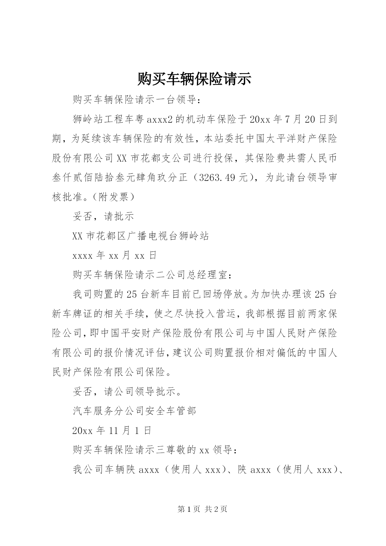第PAGE\*Arabic\*MERGEFORMAT2页共NUMPAGES\*MERGEFORMAT2页购买车辆保险请示购买车辆保险请示一台领导:狮岭站工程车粤axxx2的机动车保险于20xx年7月20日到期,为延续该车辆保险的有效性,本站委托中国太平洋财产保险股份有限公司XX市花都支公司进行投保,其保险费共需人民币叁仟贰佰陆拾叁元肆角玖分正(3263.49元),为此请台领导审核批准。(附发票)妥否,请批示XX市花都区广播电视台狮岭站xxxx年xx月xx日购买车辆保险请示二公司总经理室:我司购