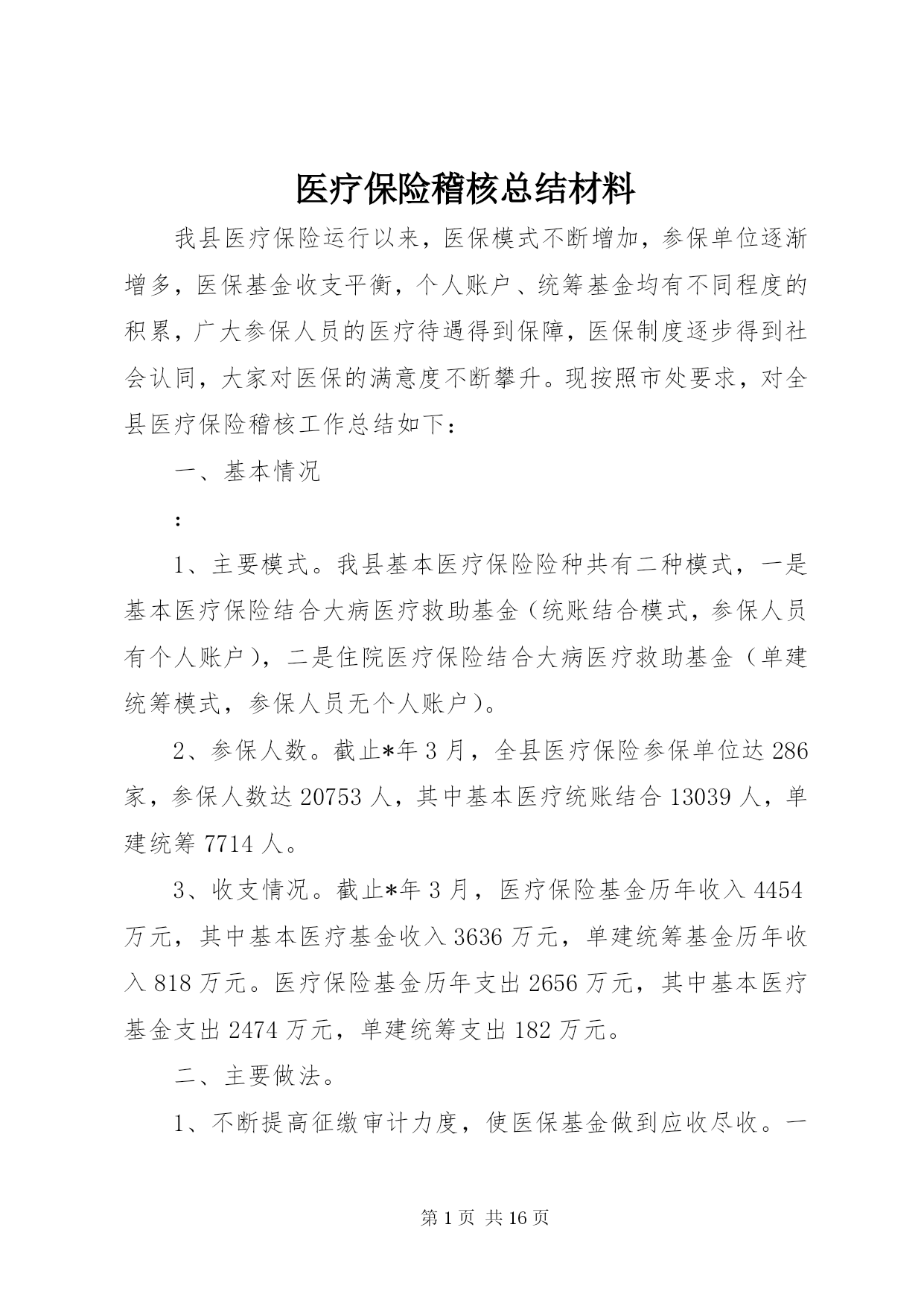第PAGE\*Arabic\*MERGEFORMAT16页共NUMPAGES\*MERGEFORMAT16页医疗保险稽核总结材料我县医疗保险运行以来,医保模式不断增加,参保单位逐渐增多,医保基金收支平衡,个人账户、统筹基金均有不同程度的积累,广大参保人员的医疗待遇得到保障,医保制度逐步得到社会认同,大家对医保的满意度不断攀升。现按照市处要求,对全县医疗保险稽核工作总结如下:一、基本情况:1、主要模式。我县基本医疗保险险种共有二种模式,一是基本医疗保险结合大病医疗救助基金(统账结合模式,参保人员