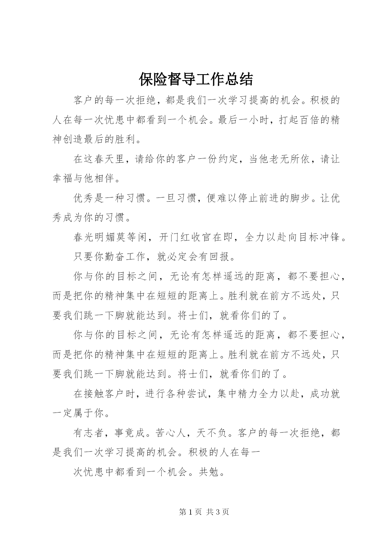 第PAGE\*Arabic\*MERGEFORMAT3页共NUMPAGES\*MERGEFORMAT3页保险督导工作总结客户的每一次拒绝,都是我们一次学习提高的机会。积极的人在每一次忧患中都看到一个机会。最后一小时,打起百倍的精神创造最后的胜利。在这春天里,请给你的客户一份约定,当他老无所依,请让幸福与他相伴。优秀是一种习惯。一旦习惯,便难以停止前进的脚步。让优秀成为你的习惯。春光明媚莫等闲,开门红收官在即,全力以赴向目标冲锋。只要你勤奋工作,就必定会有回报。你与你的目标之间,无论有怎样遥远的
