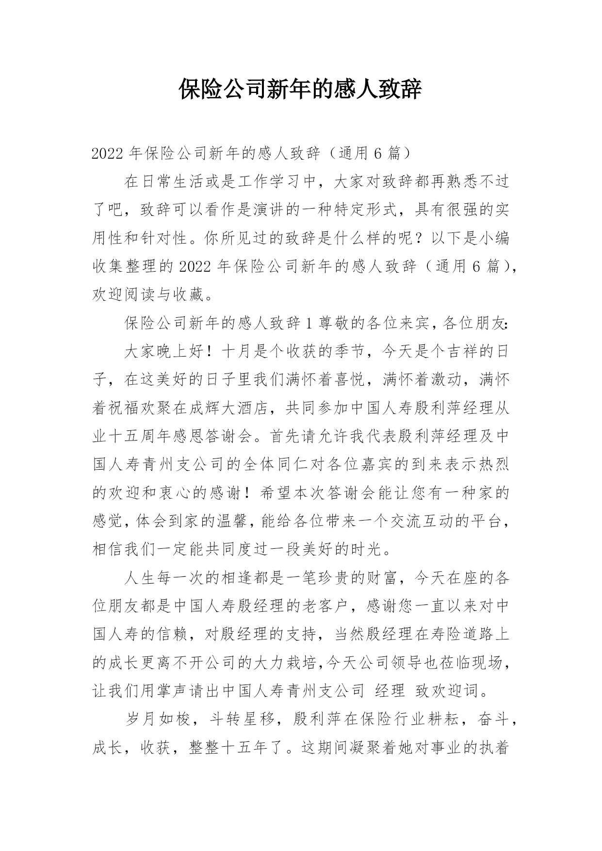 保险公司新年的感人致辞2022年保险公司新年的感人致辞(通用6篇)在日常生活或是工作学习中,大家对致辞都再熟悉不过了吧,致辞可以看作是演讲的一种特定形式,具有很强的实用性和针对性。你所见过的致辞是什么样的呢?以下是小编收集整理的2022年保险公司新年的感人致辞(通用6篇),欢迎阅读与收藏。保险公司新年的感人致辞1尊敬的各位来宾,各位朋友:大家晚上好!十月是个收获的季节,今天是个吉祥的日子,在这美好的日子里我们满怀着喜悦,满怀着激动,满怀着祝福欢聚在成辉大酒店,共同参加中国人寿殷利萍经理从业十五周年感恩答谢