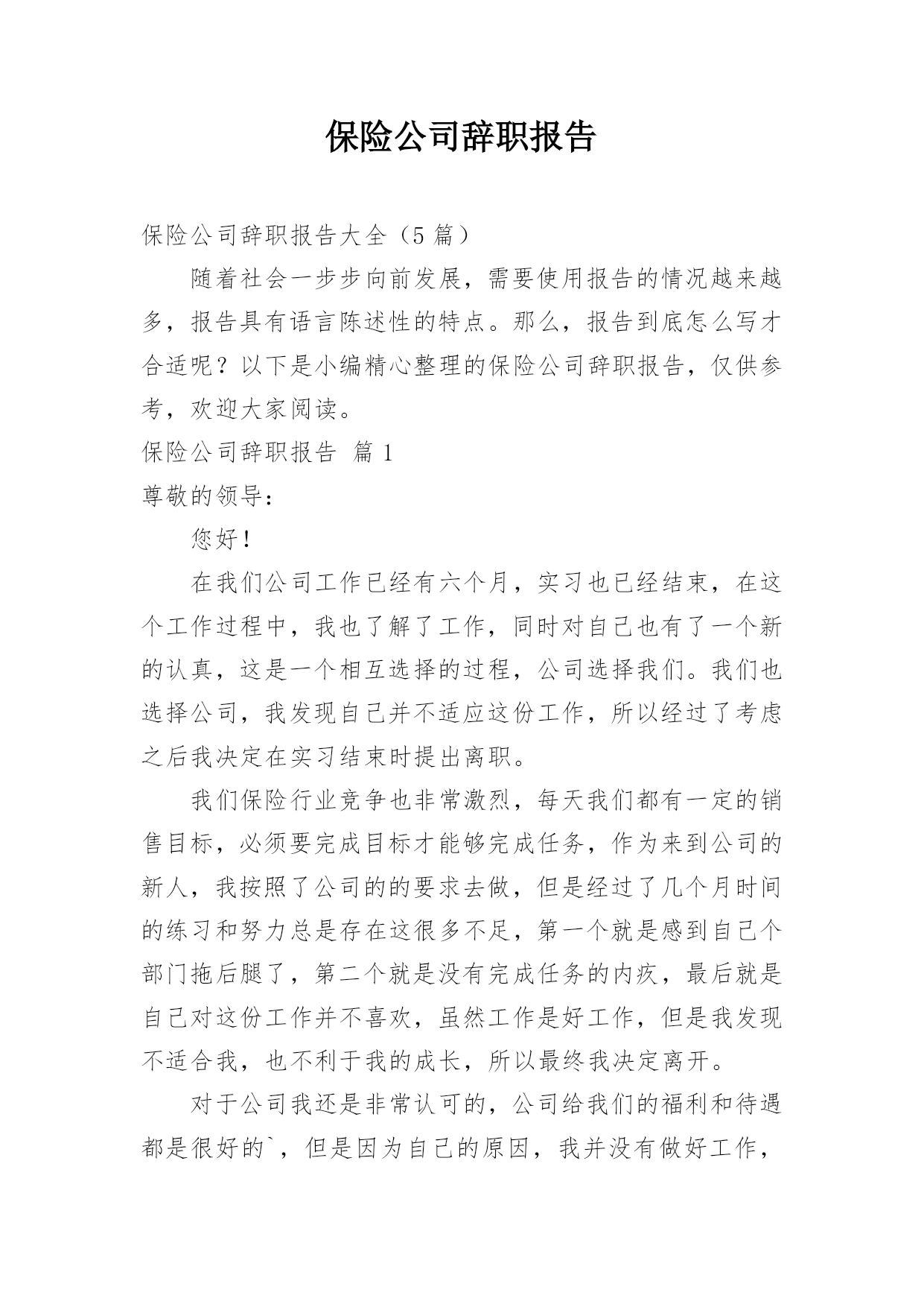 保险公司辞职报告保险公司辞职报告大全(5篇)随着社会一步步向前发展,需要使用报告的情况越来越多,报告具有语言陈述性的特点。那么,报告到底怎么写才合适呢?以下是小编精心整理的保险公司辞职报告,仅供参考,欢迎大家阅读。保险公司辞职报告篇1尊敬的领导:您好!在我们公司工作已经有六个月,实习也已经结束,在这个工作过程中,我也了解了工作,同时对自己也有了一个新的认真,这是一个相互选择的过程,公司选择我们。我们也选择公司,我发现自己并不适应这份工作,所以经过了考虑之后我决定在实习结束时提出离职。我们保险行业竞争也非常