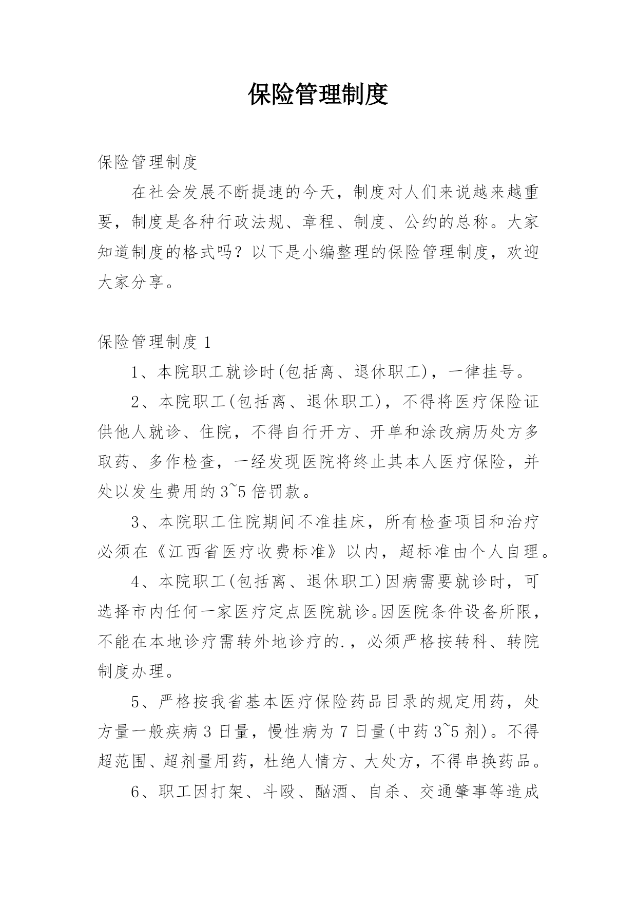 保险管理制度保险管理制度在社会发展不断提速的今天,制度对人们来说越来越重要,制度是各种行政法规、章程、制度、公约的总称。大家知道制度的格式吗?以下是小编整理的保险管理制度,欢迎大家分享。保险管理制度11、本院职工就诊时(包括离、退休职工),一律挂号。2、本院职工(包括离、退休职工),不得将医疗保险证供他人就诊、住院,不得自行开方、开单和涂改病历处方多取药、多作检查,一经发现医院将终止其本人医疗保险,并处以发生费用的3~5倍罚款。3、本院职工住院期间不准挂床,所有检查项目和治疗必须在《江西省医疗收费标准》以