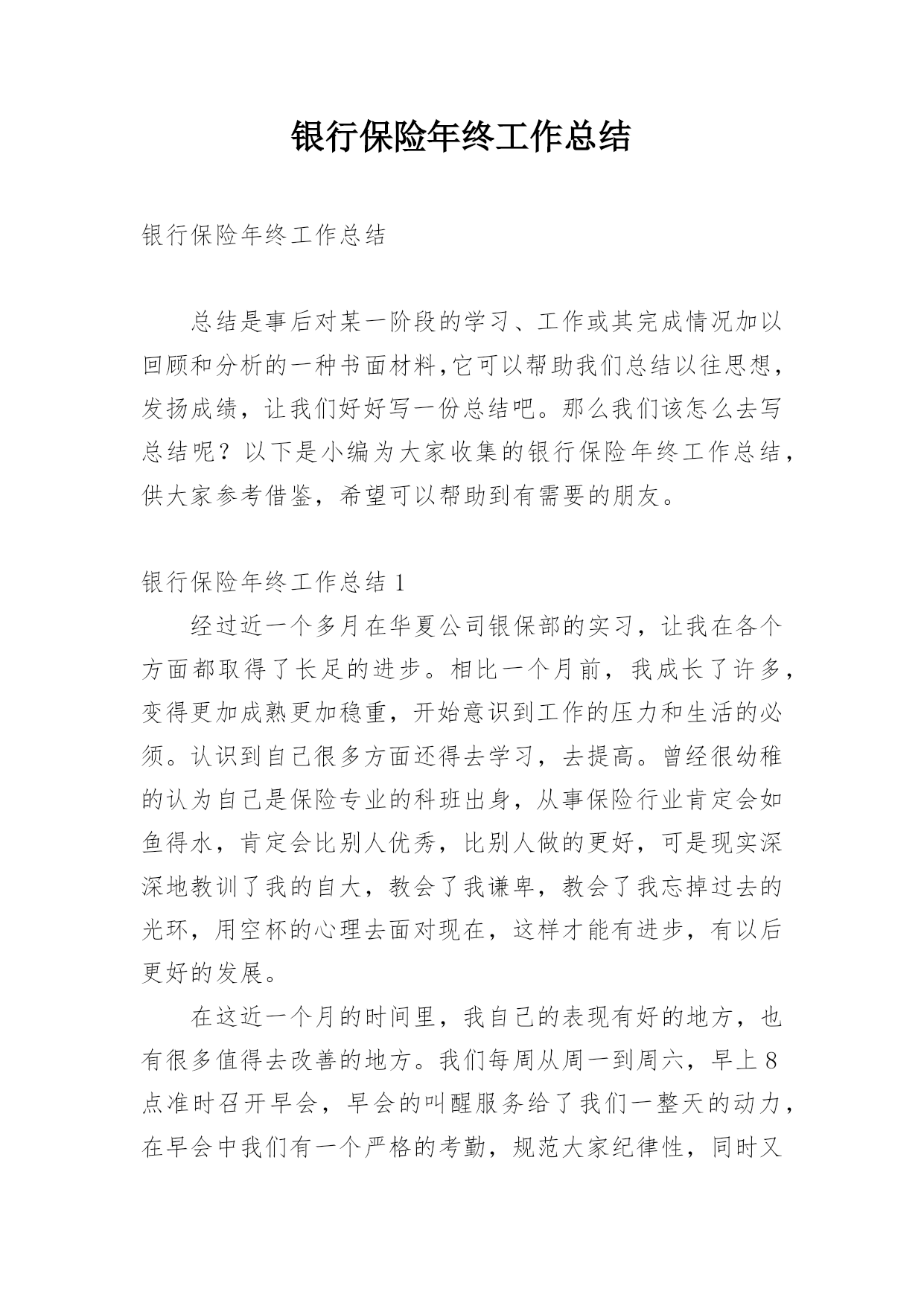 银行保险年终工作总结银行保险年终工作总结总结是事后对某一阶段的学习、工作或其完成情况加以回顾和分析的一种书面材料,它可以帮助我们总结以往思想,发扬成绩,让我们好好写一份总结吧。那么我们该怎么去写总结呢?以下是小编为大家收集的银行保险年终工作总结,供大家参考借鉴,希望可以帮助到有需要的朋友。银行保险年终工作总结1经过近一个多月在华夏公司银保部的实习,让我在各个方面都取得了长足的进步。相比一个月前,我成长了许多,变得更加成熟更加稳重,开始意识到工作的压力和生活的必须。认识到自己很多方面还得去学习,去提高。曾经