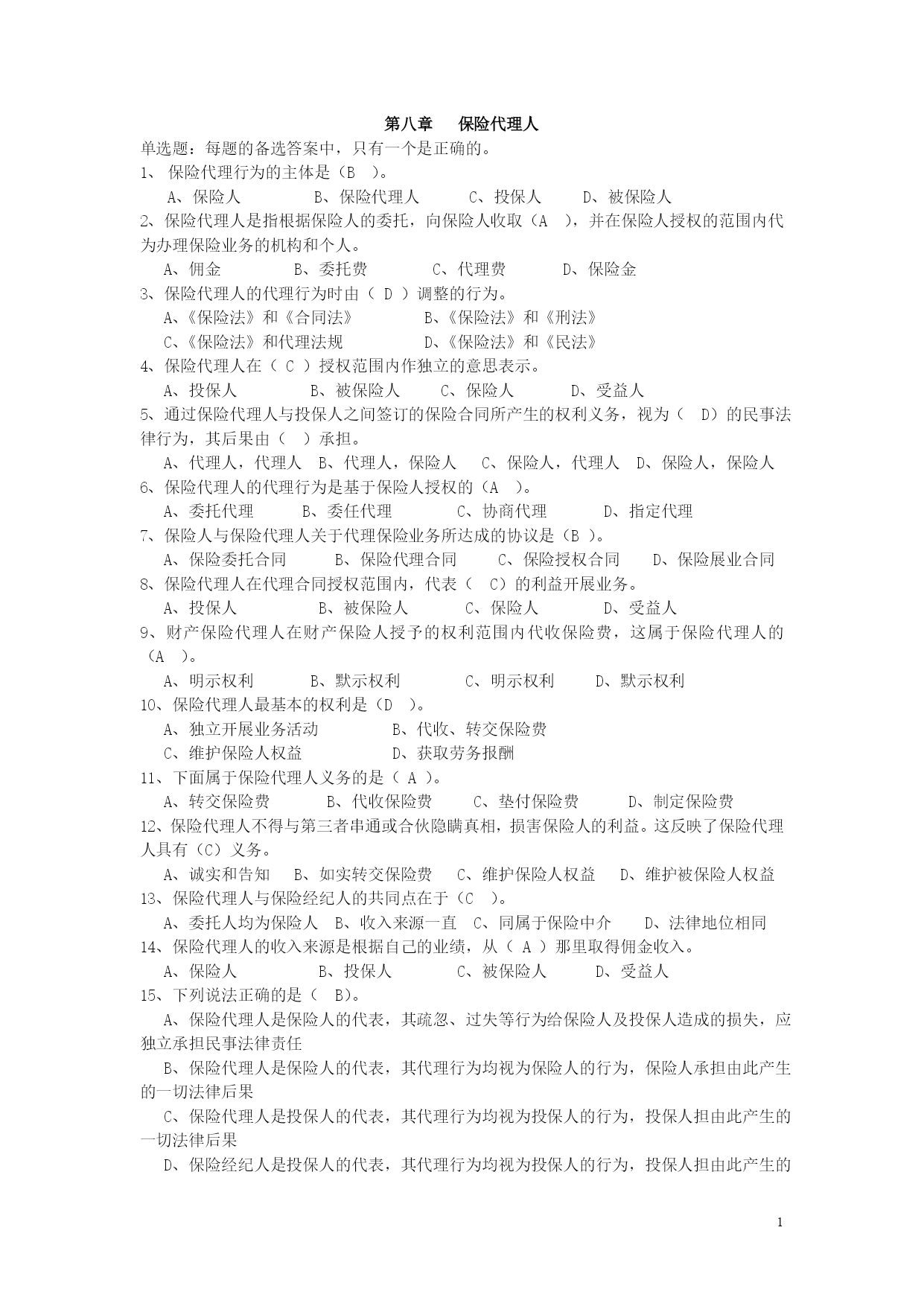 PAGEPAGE31第八章保险代理人单选题:每题的备选答案中,只有一个是正确的。保险代理行为的主体是(B)。A、保险人B、保险代理人C、投保人D、被保险人2、保险代理人是指根据保险人的委托,向保险人收取(A),并在保险人授权的范围内代为办理保险业务的机构和个人。A、佣金B、委托费C、代理费D、保险金3、保险代理人的代理行为时由(D)调整的行为。A、《保险法》和《合同法》B、《保险法》和《刑法》C、《保险法》和代理法规D、《保险法》和《民法》4、保险代理人在(C)授权范围内作独立的意思表示。A、