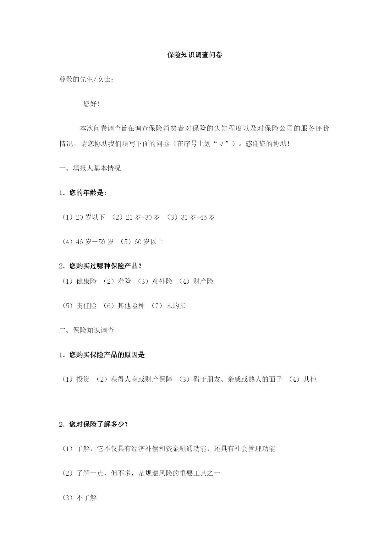 保险知识调查问卷尊敬的先生/女士:您好!本次问卷调查旨在调查保险消费者对保险的认知程度以及对保险公司的服务评价情况,请您协助我们填写下面的问卷(在序号上划“√”)。感谢您的协助!一、填报人基本情况1.您的年龄是:(1)20岁以下(2)21岁-30岁(3)31岁-45岁(4)46岁-59岁(5)60岁以上2.您购买过哪种保险产品?(1)健康险(2)寿险(3)意外险(4)财产险(5)责任险(6)其他险种(7)未购买二、保险知识调查1.您购买保险产品的原因是(1)投资(2)获得人身或财产保障(3)碍于朋友、亲戚